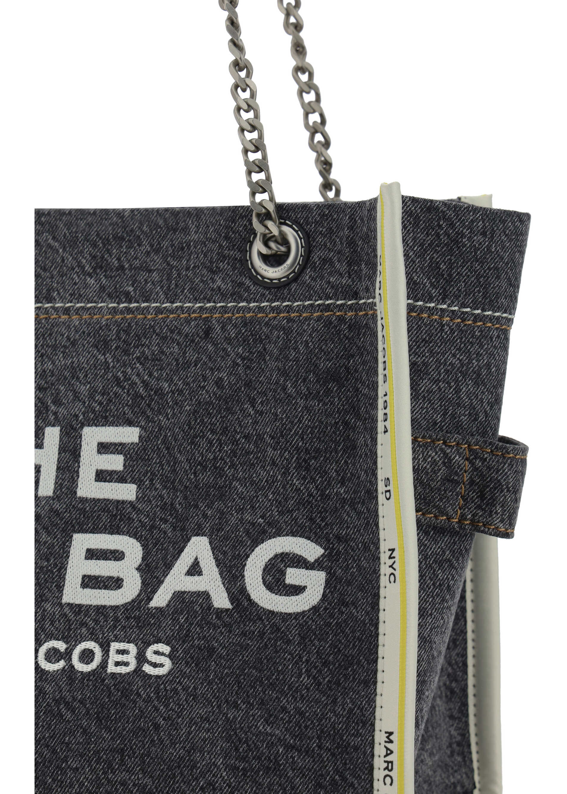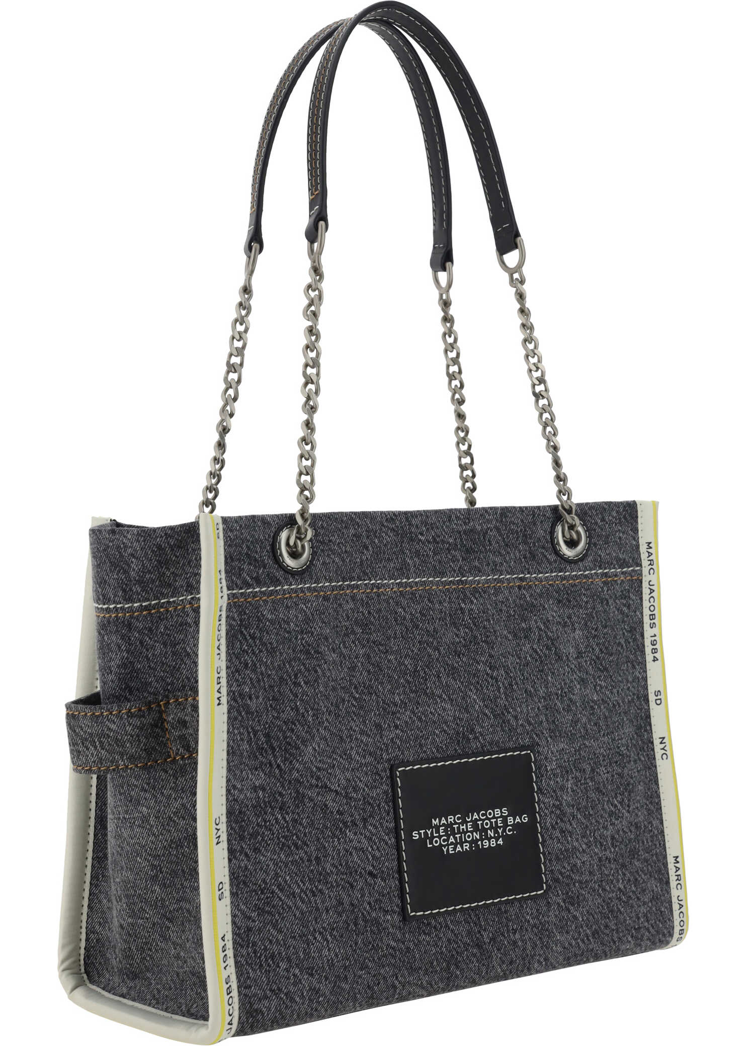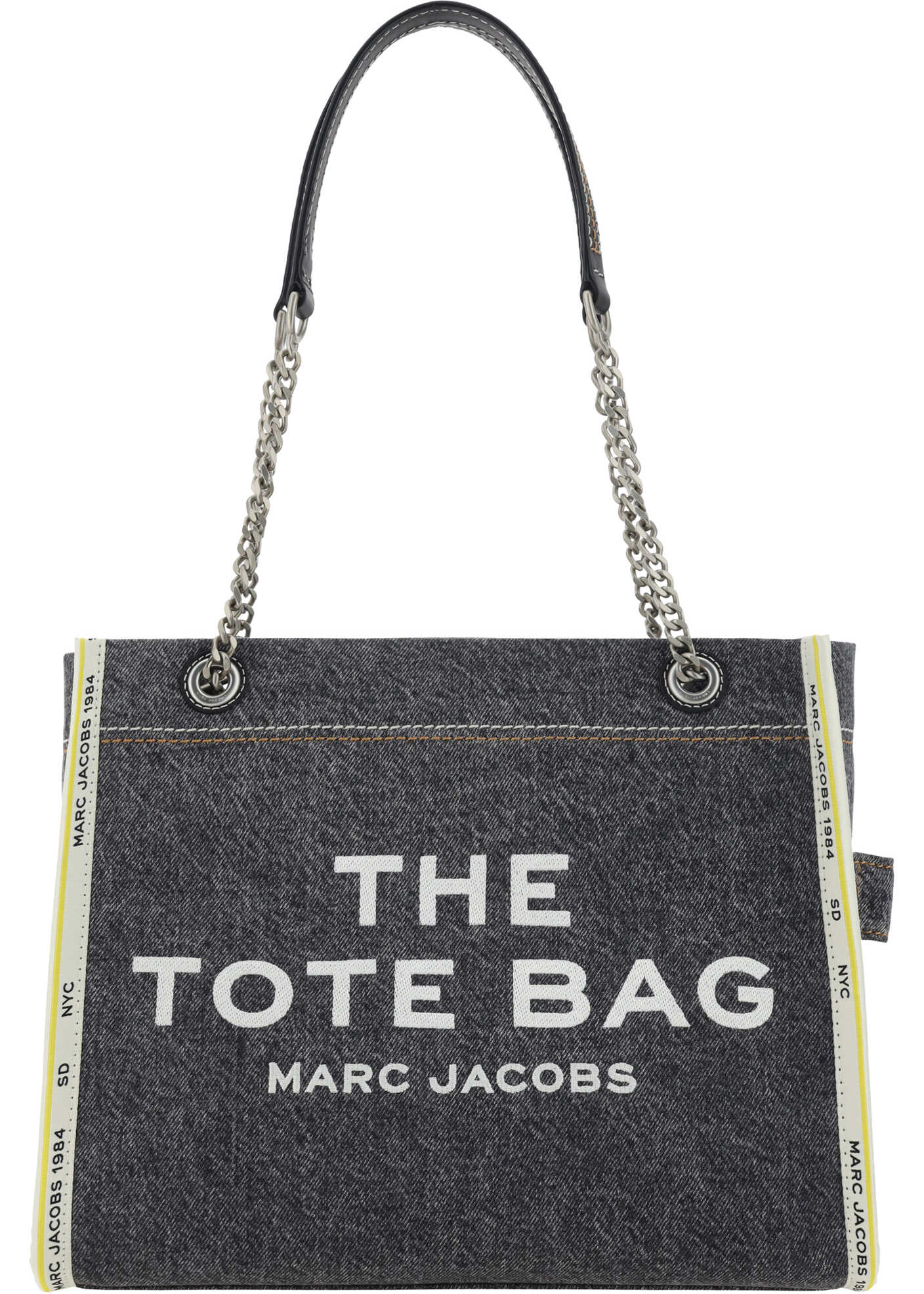 Cotton The Medium Tote Shoulder Bag by Marc Jacobs featuring denim design, two chain handles with leather detail at top, top zipper closure, single interior pocket, contrasting iconic brand monogram print at front, contrasting iconic brand monogram patch applied at back.