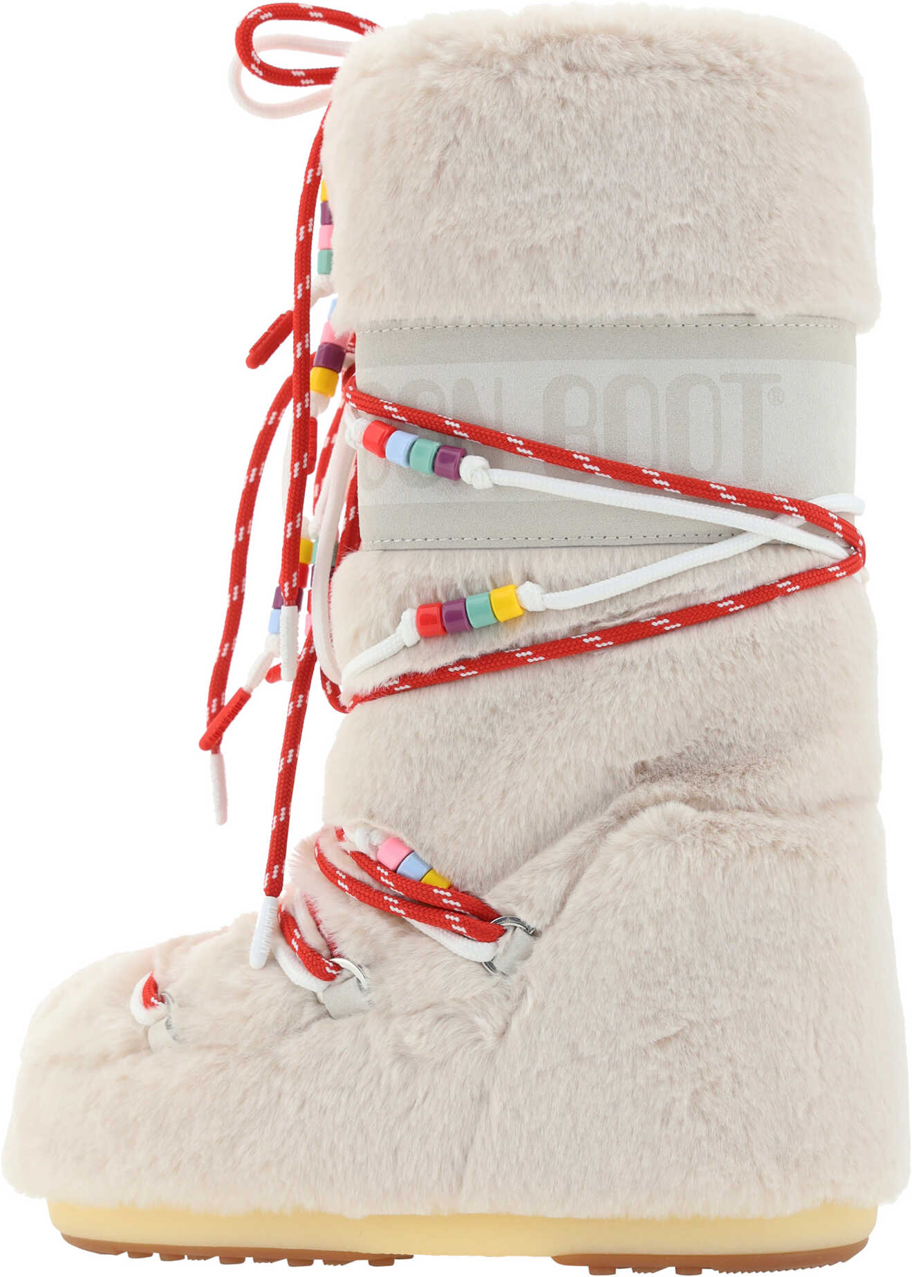 Icon Faux Fur Boots by Moon Boot, all-over fur design, suede detailing, beaded appliqué detail on laces, iconic brand monogram printed in contrasting color on shaft, front laces for closure, platform sole, below-the-knee model.