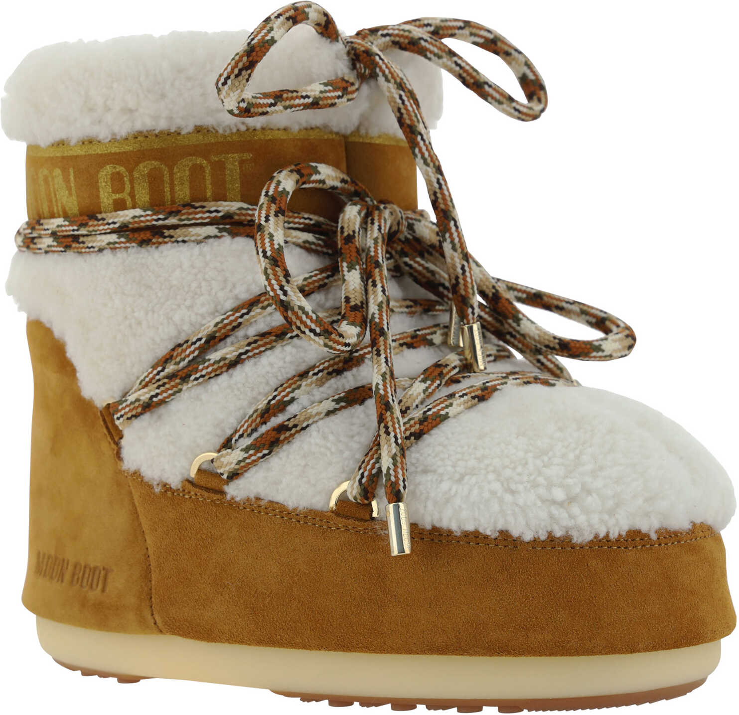 Calfskin Icon Low Lab69 Boots by Moon Boot, padded design with faux fur, iconic brand monogram printed in contrasting color on the shaft, suede detail, front laces for closure, platform sole, ankle-length model.