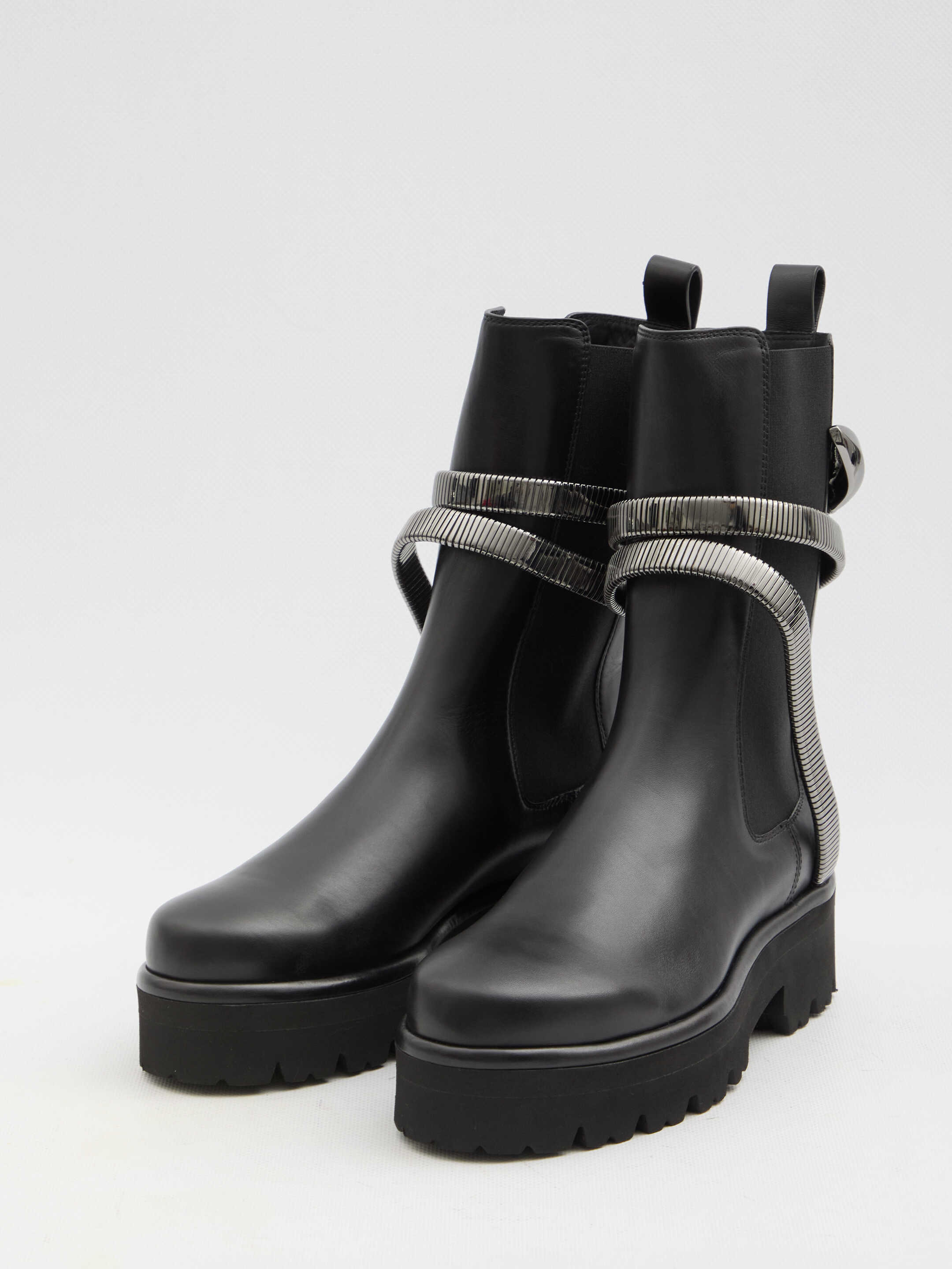 Juniper 45 biker boots in black calfskin with silver metal mesh serpent. They feature side elasticated inserts, rear loop tab and lug rubber sole. Dust bag included. Any leather imperfections are not to be considered manufacturing defects, but a peculiarity of the material.