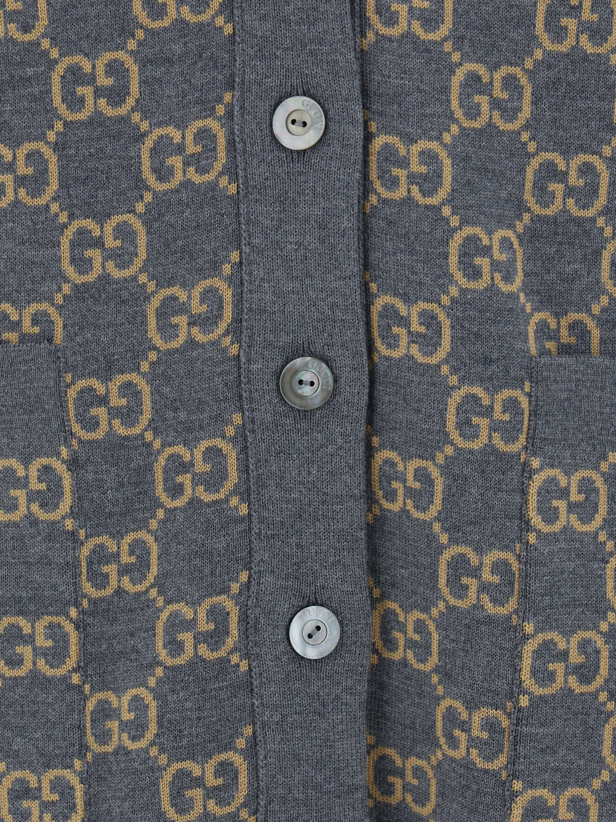 Reversible Wool Cardigan by Gucci, V-neck, front button closure, two front welt pockets with flaps, ribbed hem, ribbed cuffs, iconic all-over printed brand pattern, regular fit.