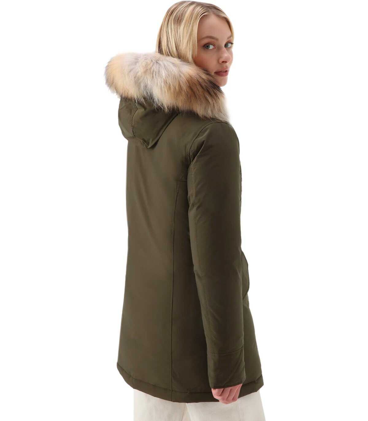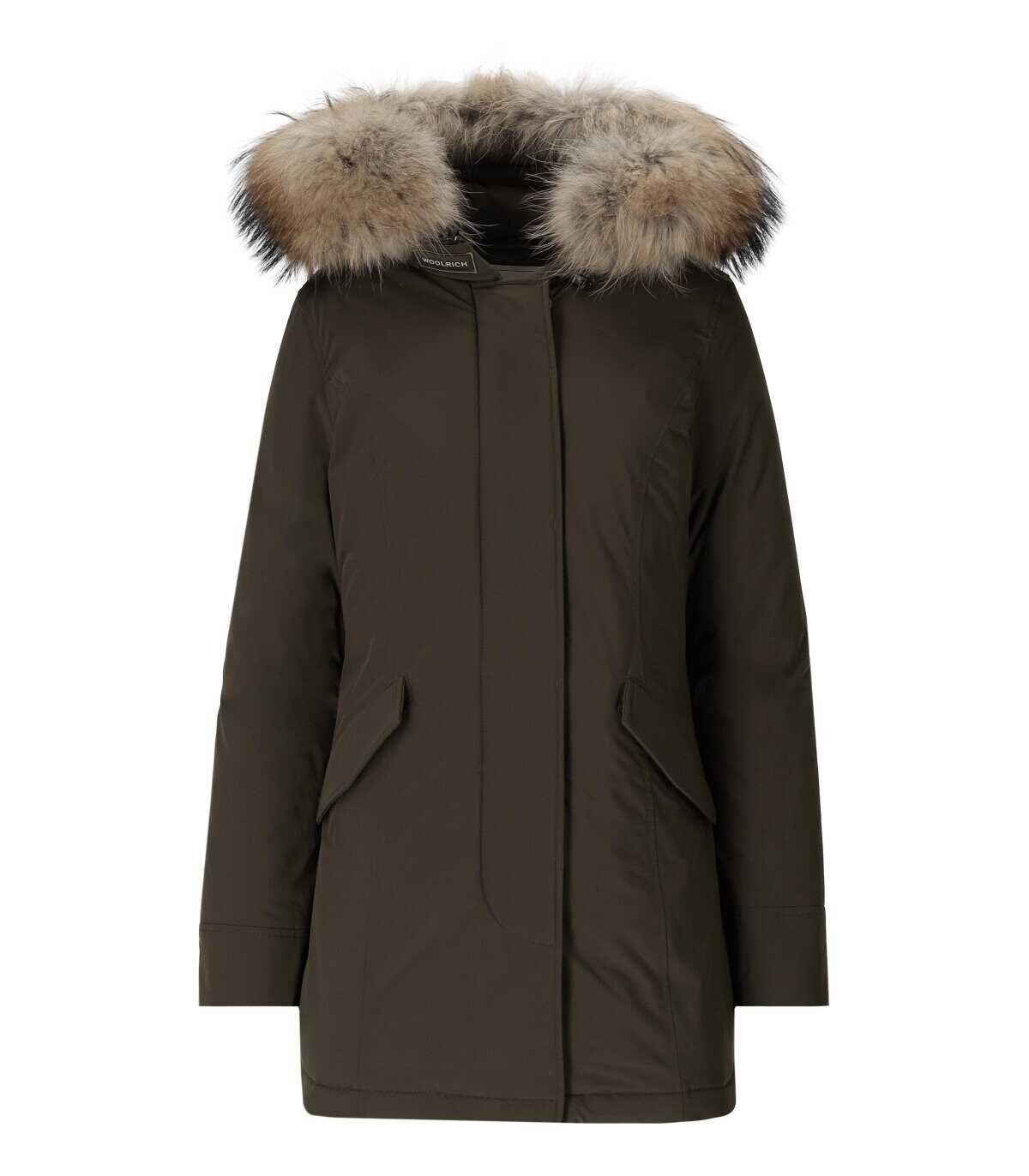 Luxury Arctic Raccoon parka by Woolrich made of military green Urban Touch, a water-repellent and wind-resistant fabric, with duck down padding. It features flap pockets on the front, logo label on the side and ribbed stretch fabric cuffs. Hood with adjustable drawstring equipped with removable real Murmasky fur insert. Logo tape on the neck, zip and button closure.