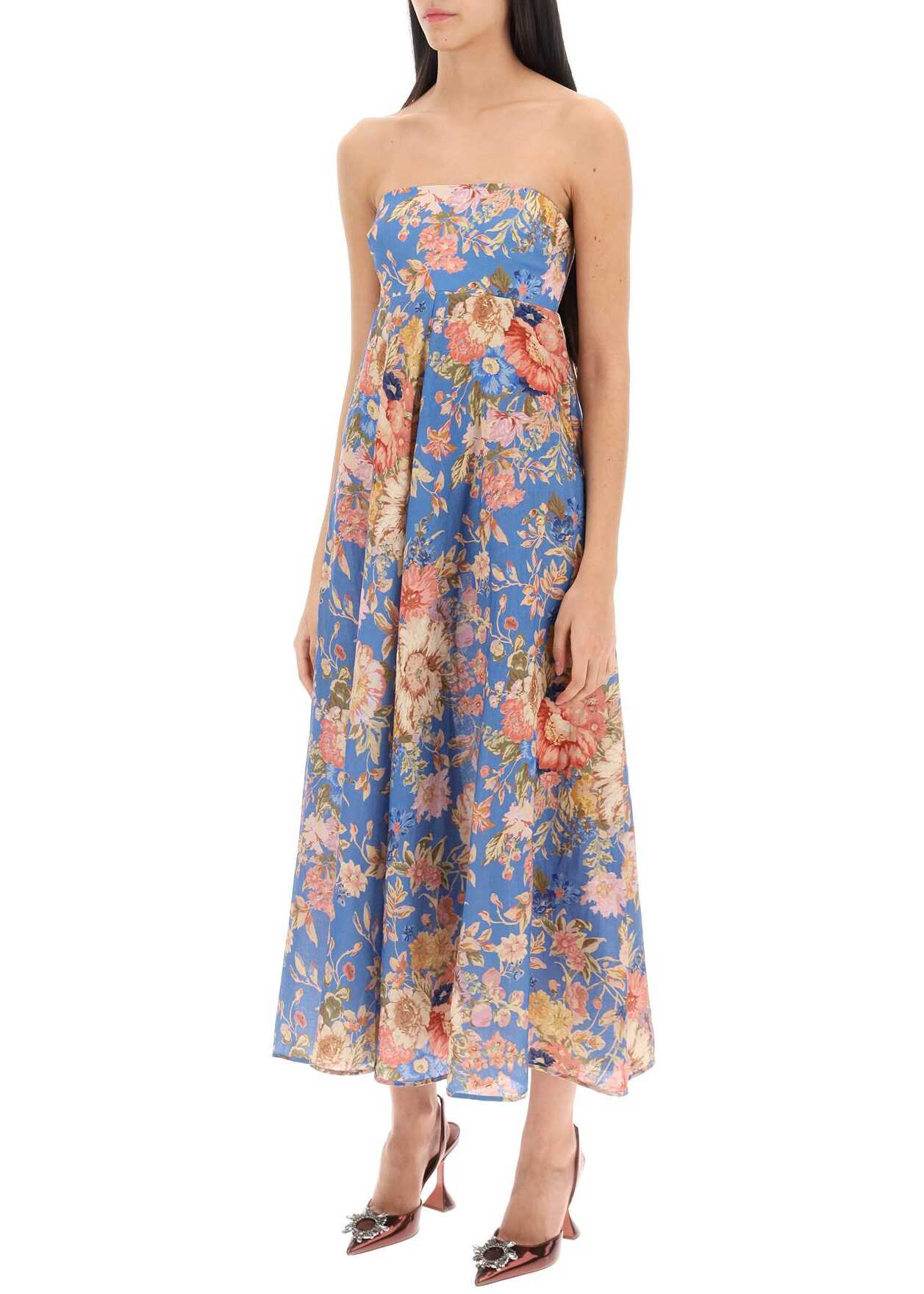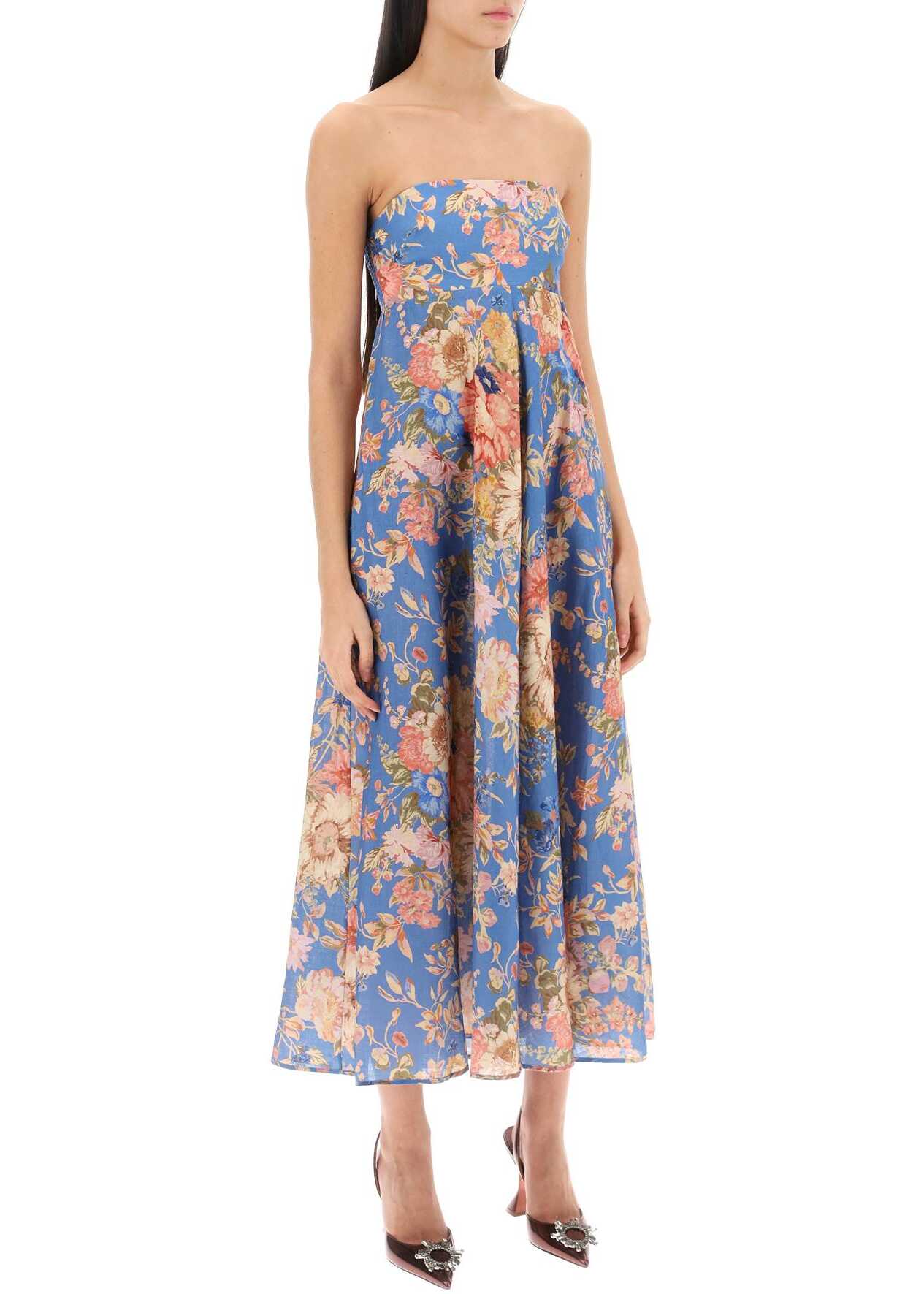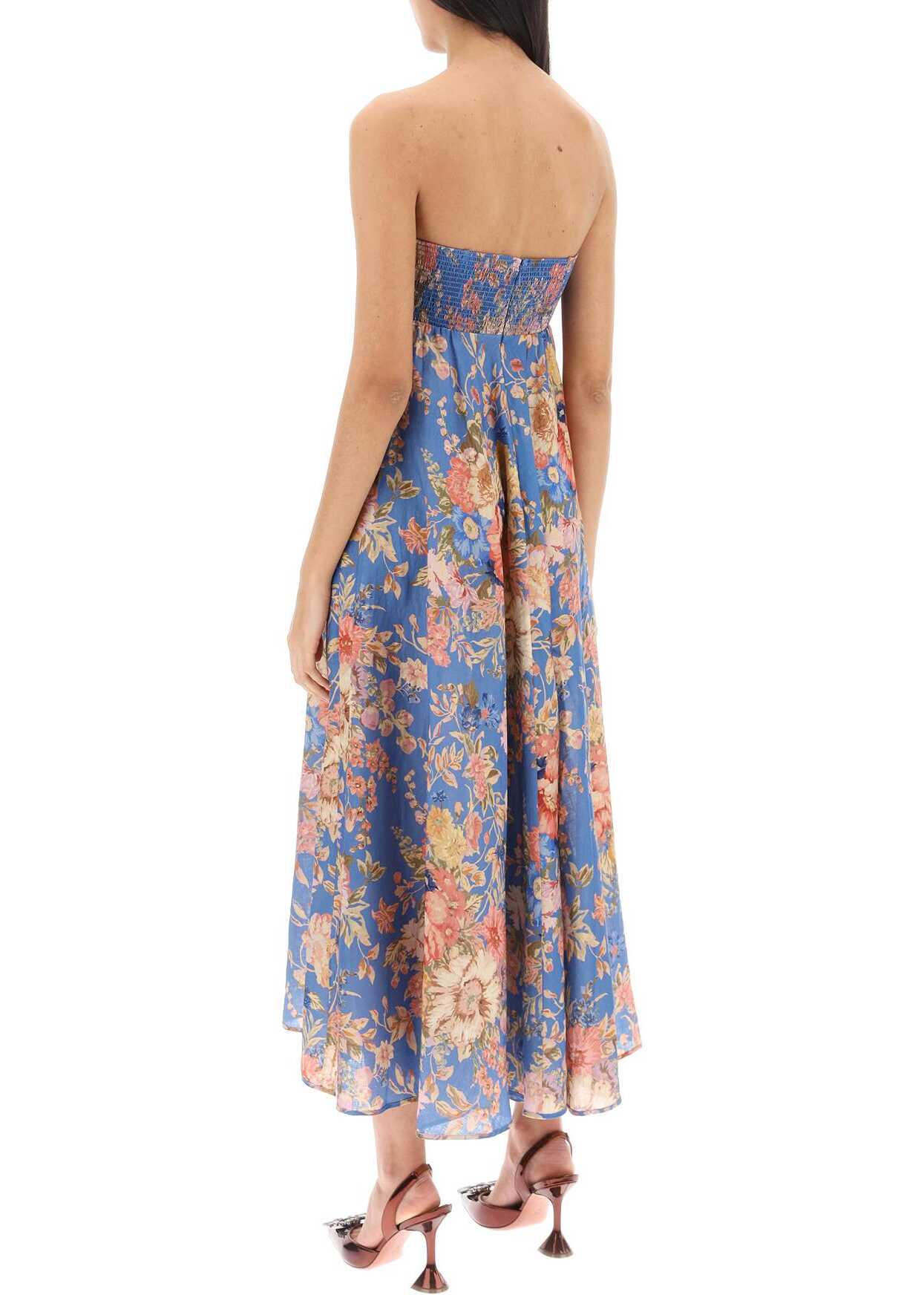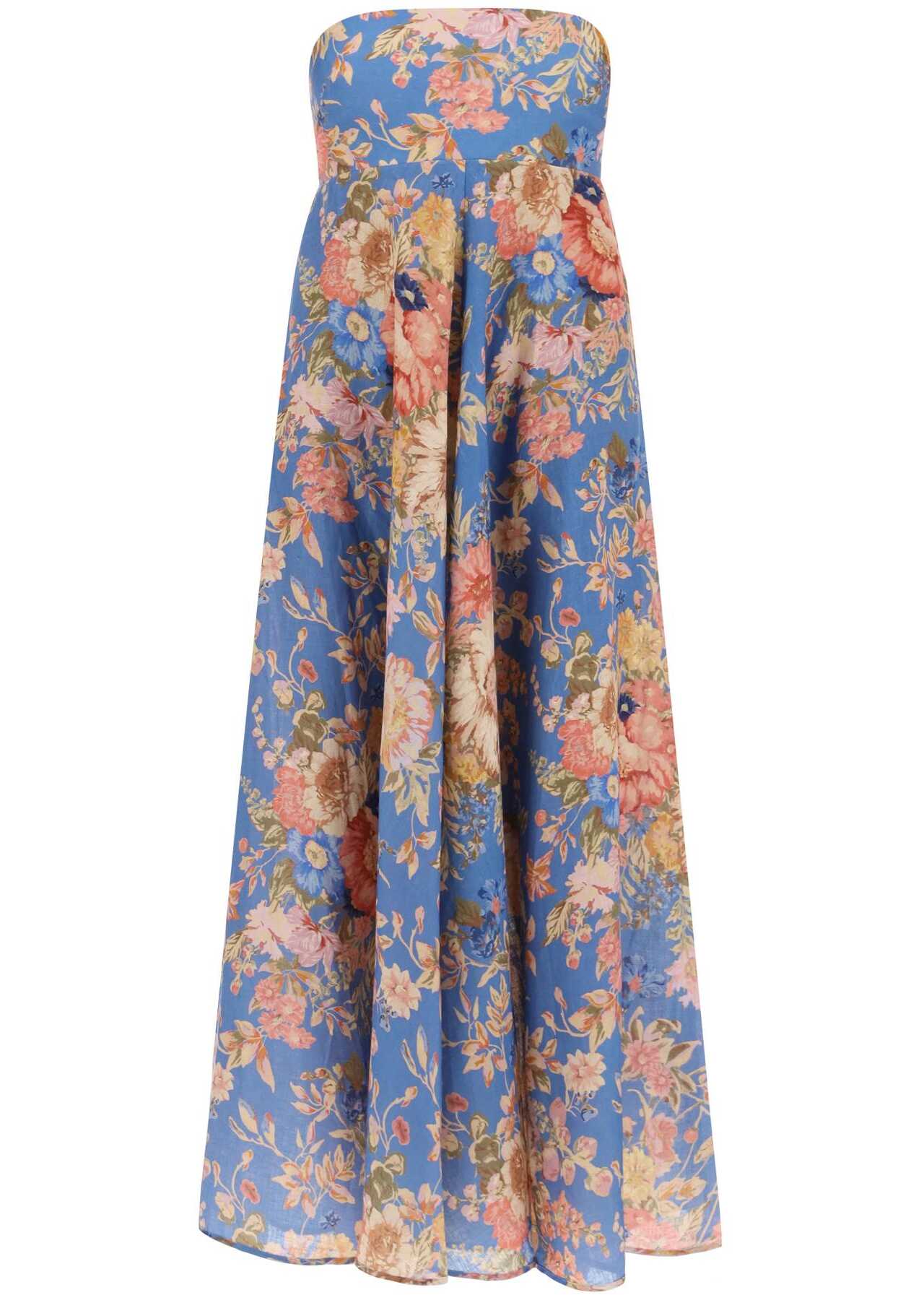 Zimmermann midi dress in floral-printed linen, cut to an empire silhouette with strapless bandeau bodice and flared skirt. The bodice features a smocked back and boned side seams. Back invisible zip fastening, unlined interior. The model is 177 cm tall and wears a size 1 Zimmermann.