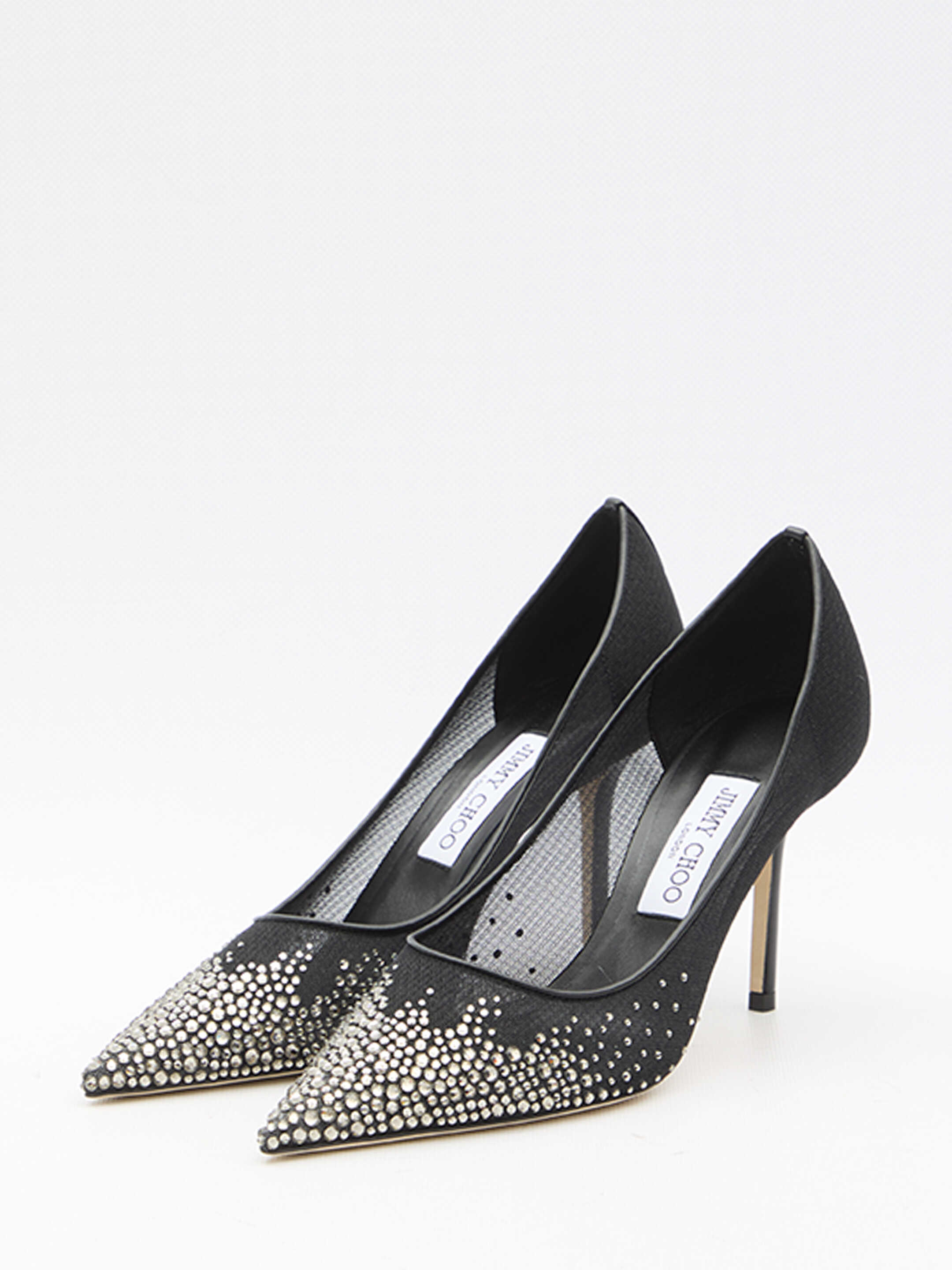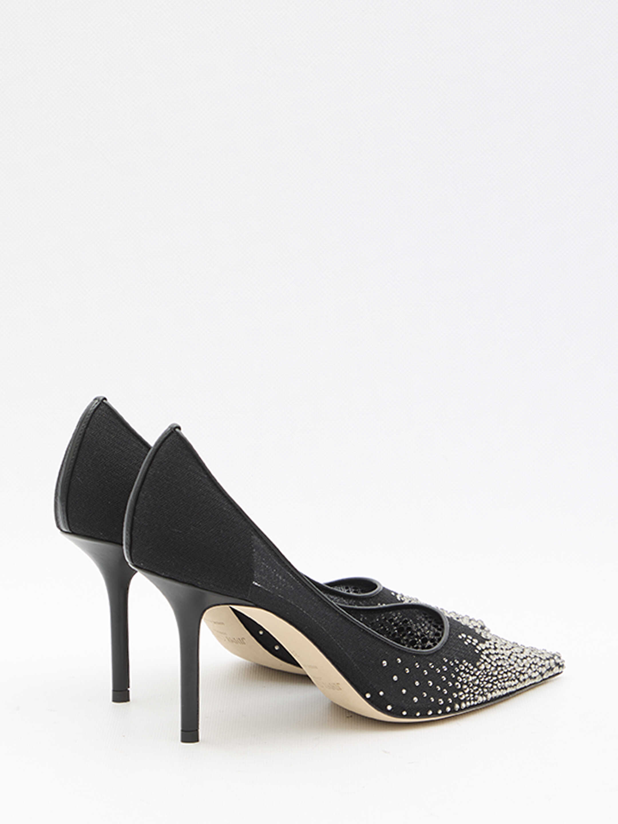 Love 85 pumps in black mesh with dégradé crystals. They feature pointed design, stiletto heel and leather sole.