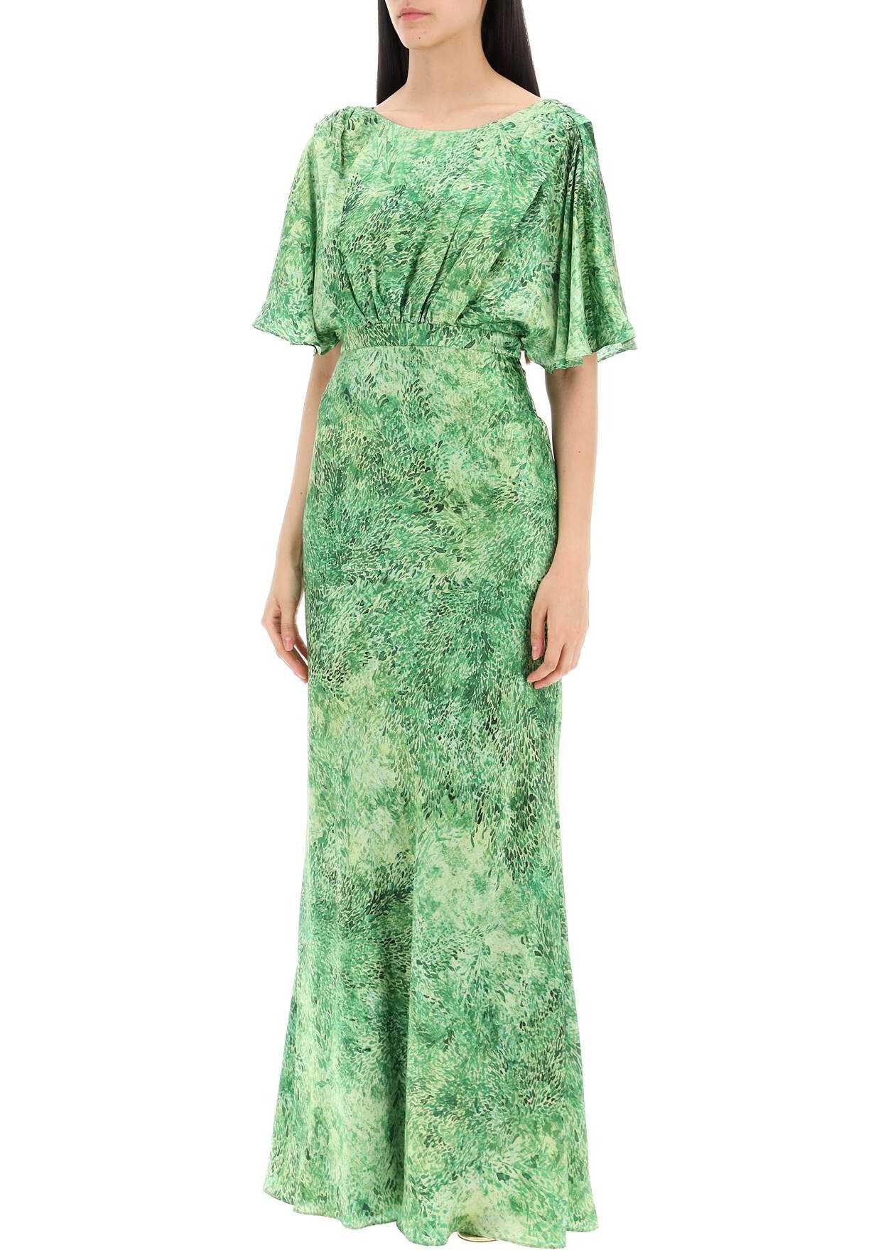 An overlay of brushstrokes in shades of green creates an undergrowth effect that is accentuated by the sheen of pure silk hammered satin. Fluid and delicate, Saloni's maxi dress enhances the silhouette with a high-waisted cut that cinches a draped, flutter-sleeved bodice, then falls to the floor in a figure-skimming skirt with a softly flared hem. The boat neckline plunges into a deep V at the back for a sensual touch. Full lining, back invisible zip closure. The model is 177 cm tall and wears a size UK 8.