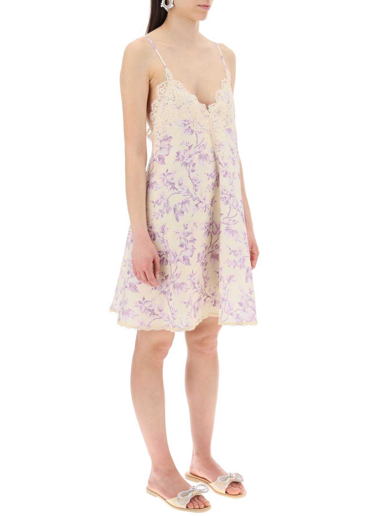 Adorned with a floral print in shades of lilac, this Zimmermann mini dress is made from pure linen in a delicate cream yellow hue. It features a slip-style design with a wide V-neckline trimmed with lace and thin adjustable straps crisscrossing at the back. The dress is characterized by its soft and flared silhouette with a slightly fitted fit on the bust. The hem is edged with lace. The model is 177 cm tall and wears size 0.