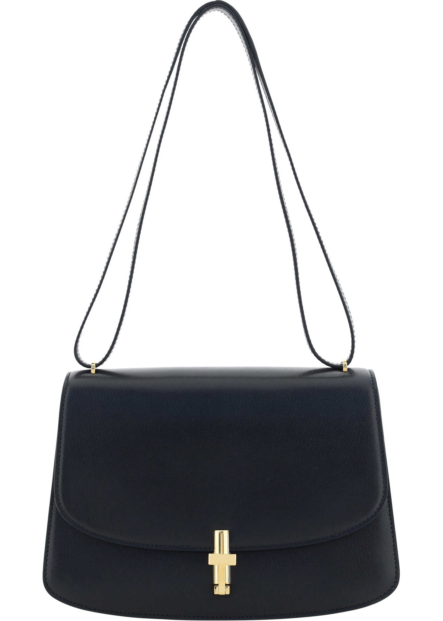 Calfskin Sofia 10.00 Shoulder Bag by The Row, rigid design, double adjustable shoulder strap, front padlock closure on front flap, single interior compartment, flat pockets inside.