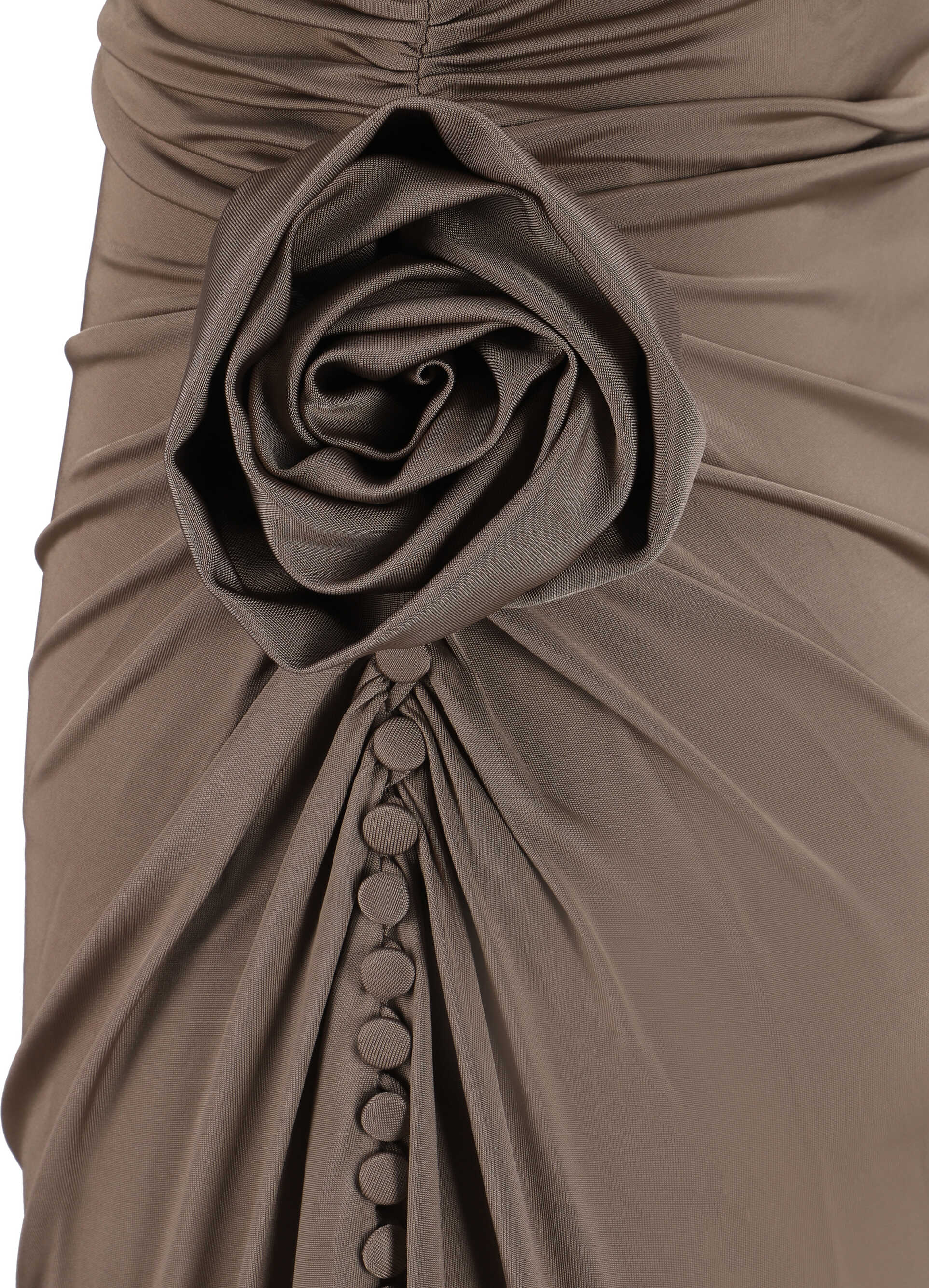 Long Dress by Magda Butrym, long pattern, 3D pink applique detail on side panel, ruched ruffle effect details on side panels, soft front neckline, monochrome pattern, slim fit.