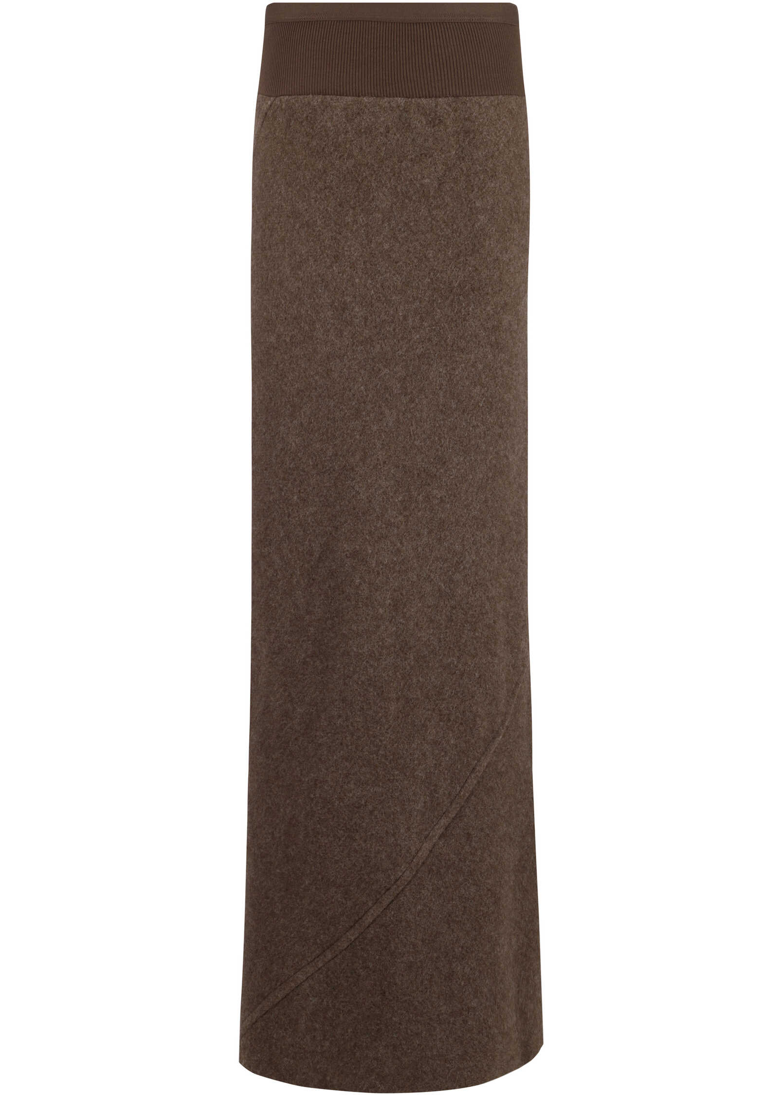 Virgin Wool Long Skirt by Rick Owens features ribbed high elastic waistband, paneled design, drape detail at back, mélange pattern, regular fit.