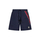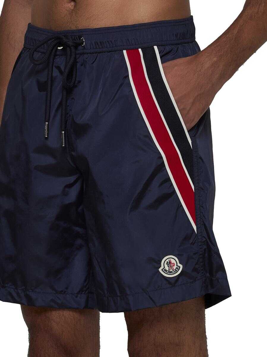 Moncler’s blue nylon swim shorts featuring elasticated waist with adjustable drawstring, side pockets, tricolor band on the left side + logo patch and back pockets with flap and button.
