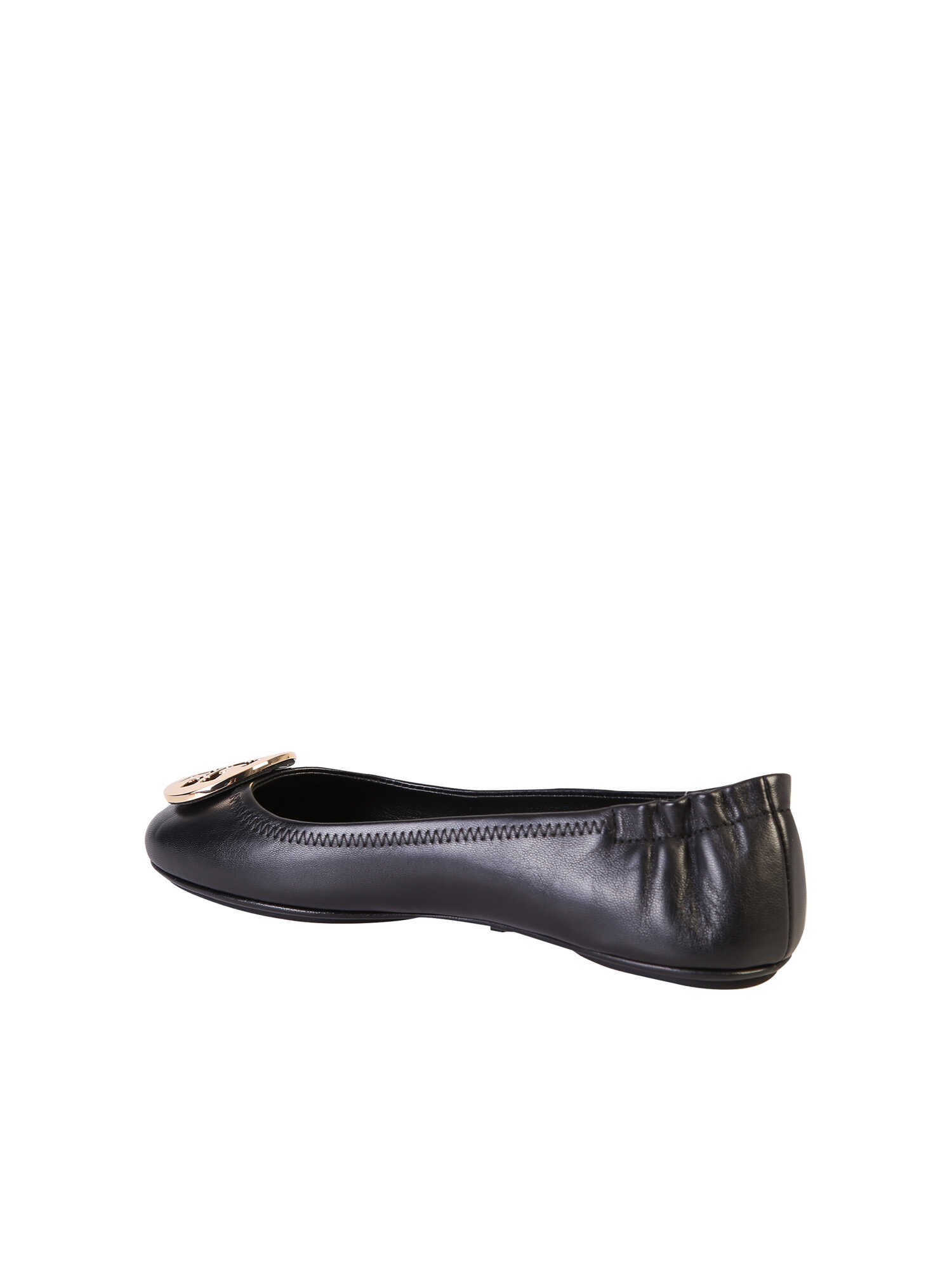 Step out in style with these TORY BURCH Black Flats. Made from 100% Leather, these Minnie leather ballerina flats feature a front logo metal plate, elasticated heel, and a leather inner. The rubber sole provides utmost comfort and durability. Perfect for women who want to make a fashion statement. Shop now and experience luxury like never before!