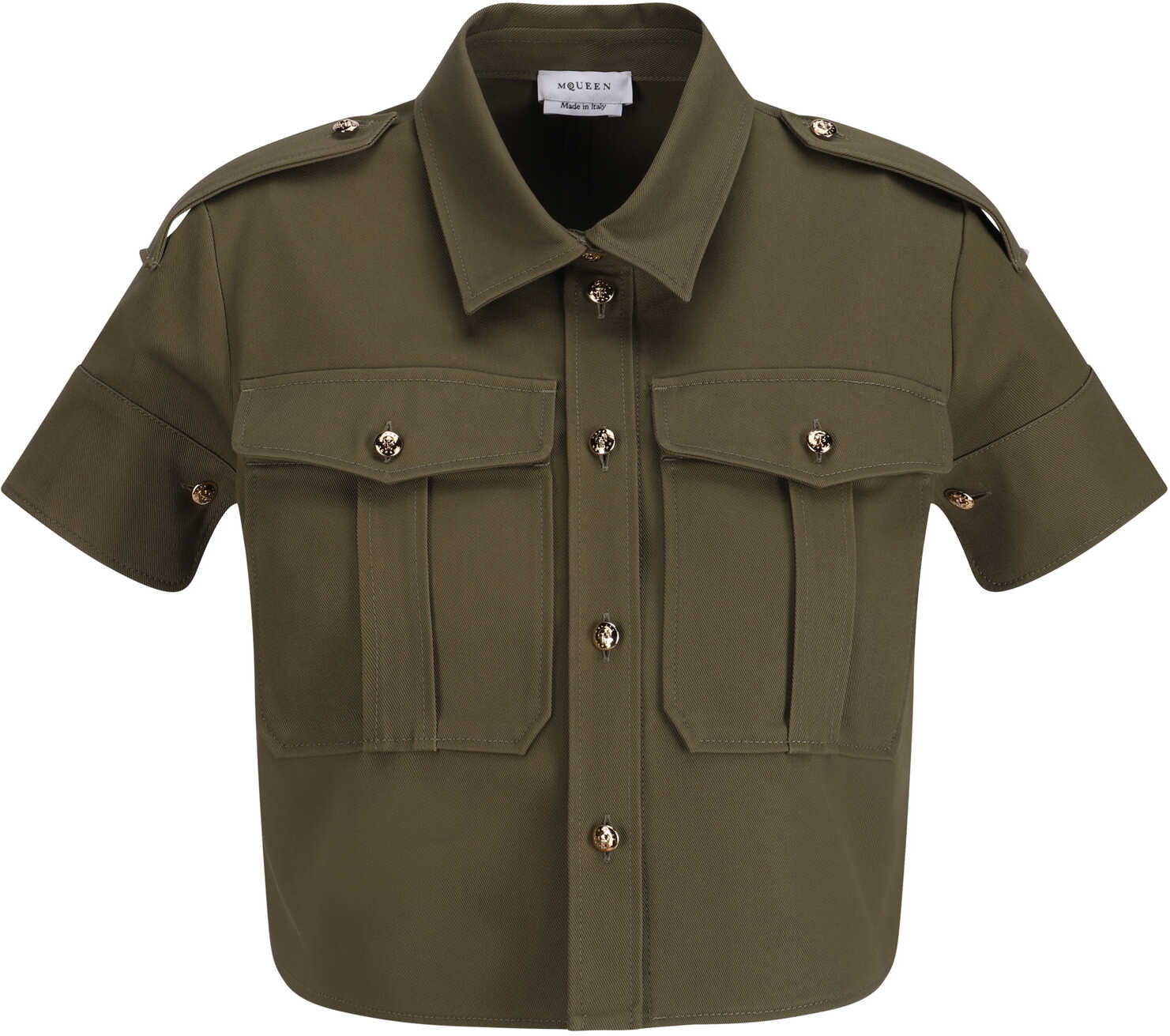 Cotton Shirt by Alexander Mcqueen, cropped pattern with short sleeves, classic collar, front button closure, two front patch pockets with button-fastening flap, monochrome pattern, fitted fit.