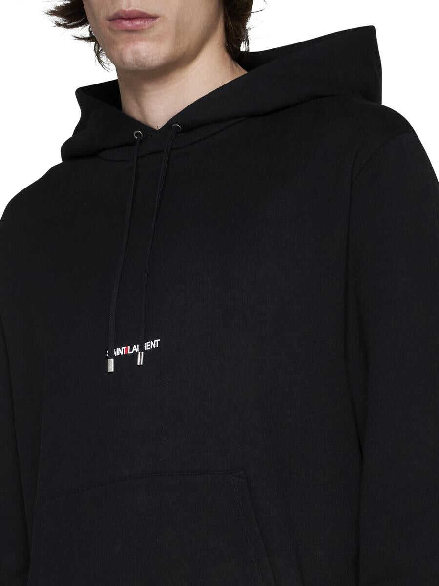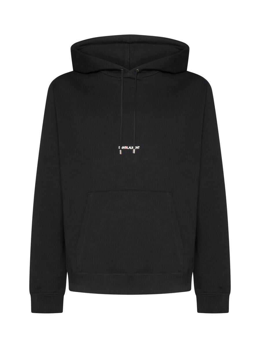 Black stretch cotton logo-print hoodie from SAINT LAURENT featuring drawstring hood, drop shoulder, long sleeves, logo print to the front, front pouch pocket, ribbed cuffs and ribbed hem.