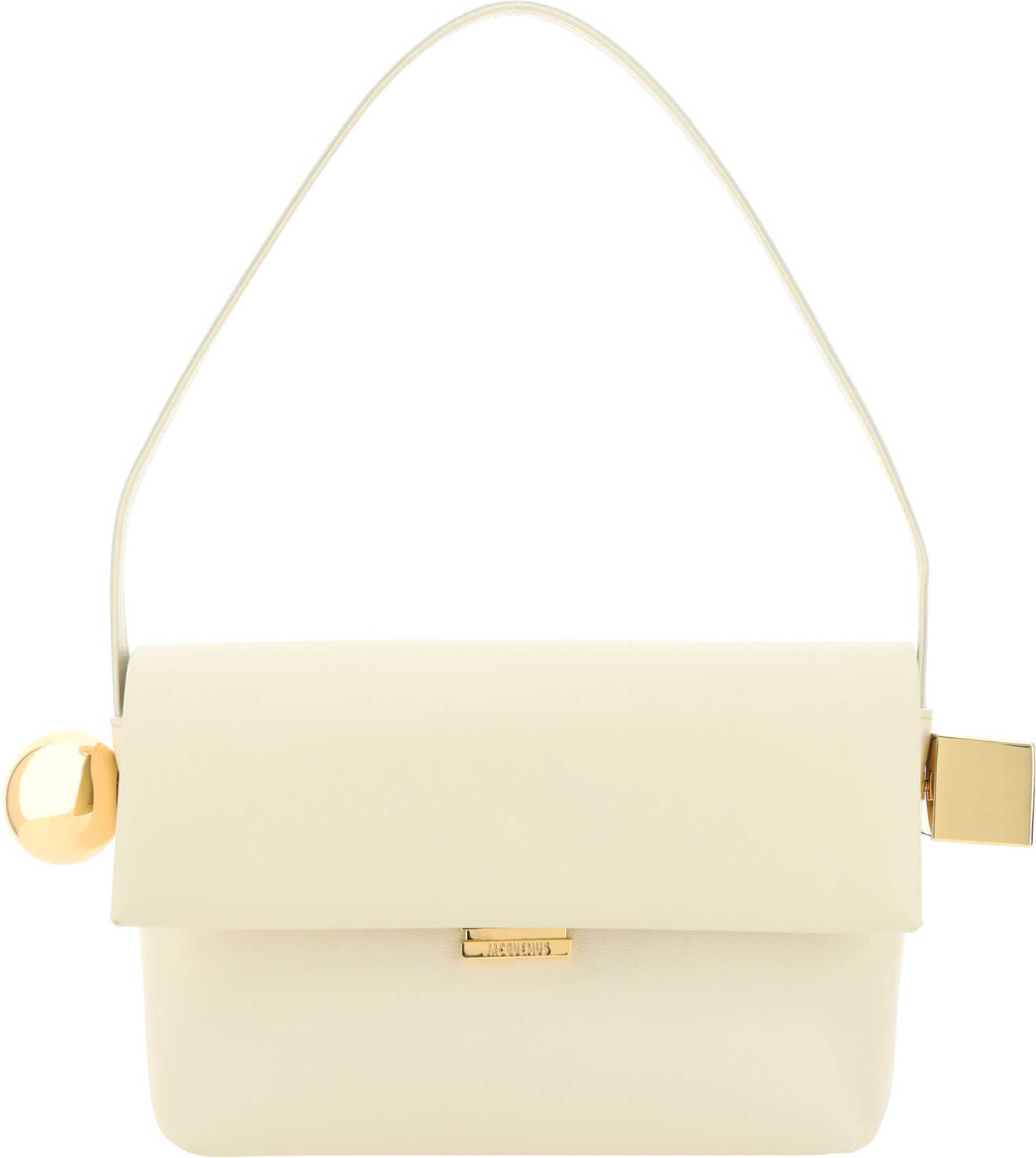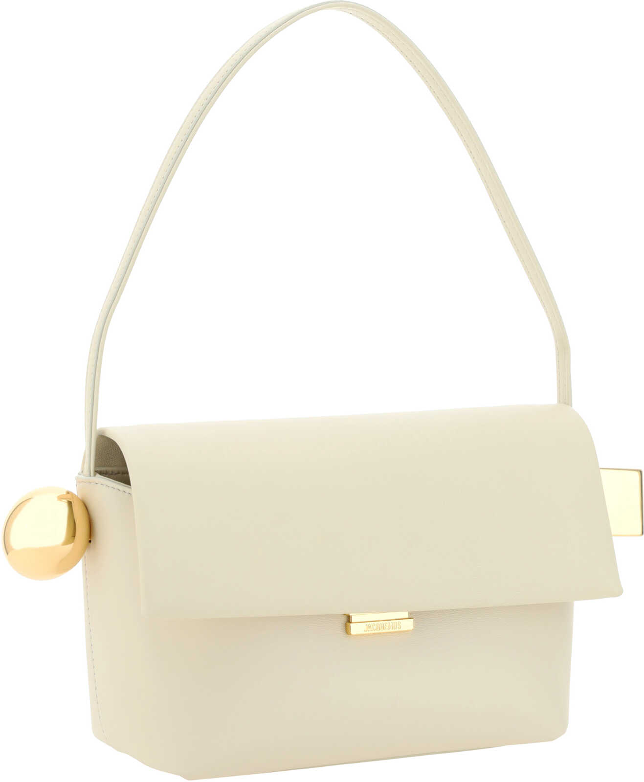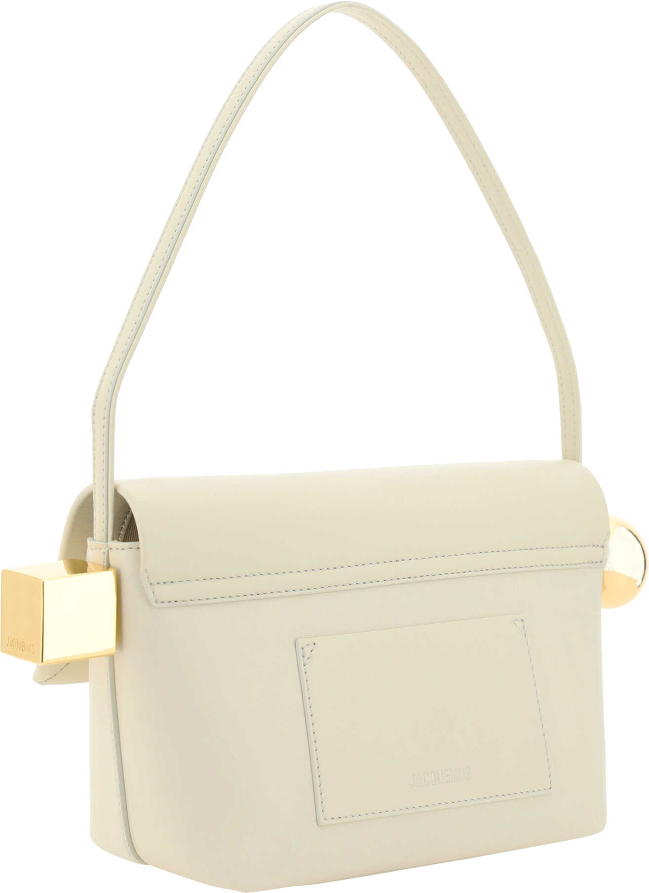 Leather Le Bambola Shoulder Bag by Jacquemus, a flat shoulder strap at top, top closure by flap and clasp, a patch pocket on back panel, steel geometric details at sides, monochrome pattern.