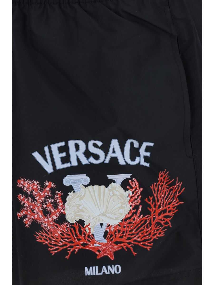 Black Versace boxer swimwear. Drawstring waist. Adjustable waist lace. White front logo lettering. Frontal sea print. - Versace - Black - Men's - Front logo print
