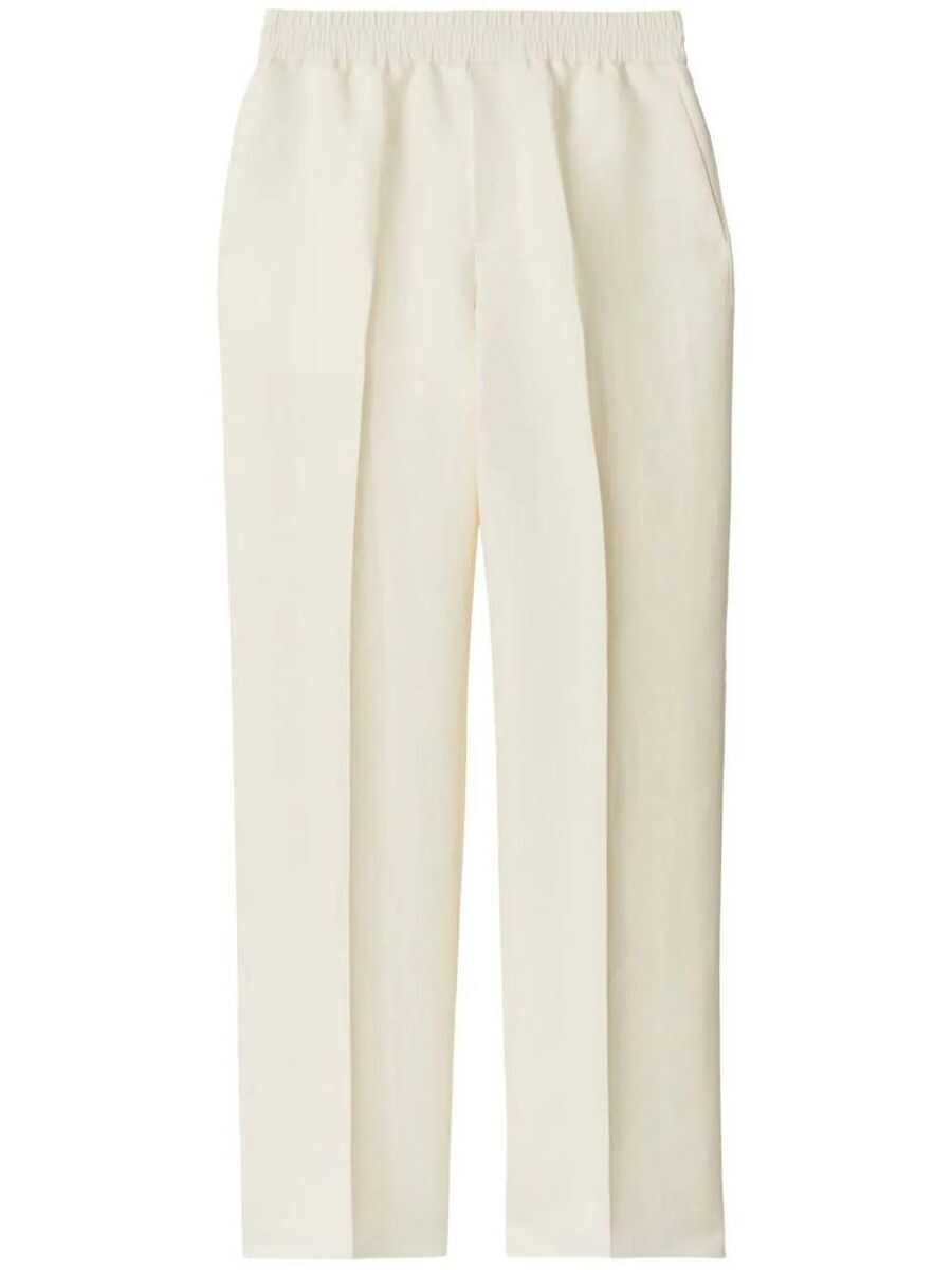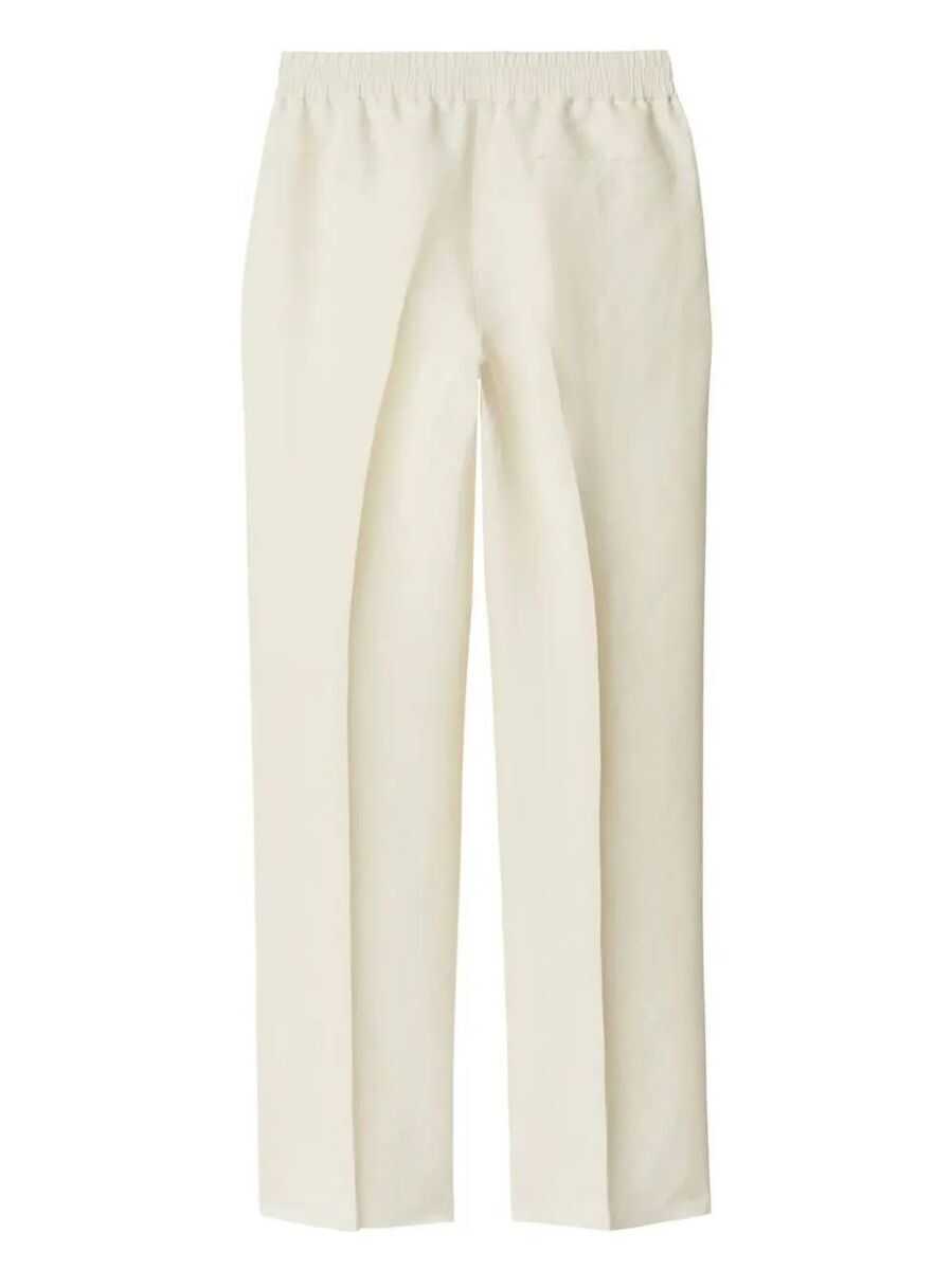 cream white paper blend elasticated waistband two side slit pockets pressed crease rear welt pocket tapered leg