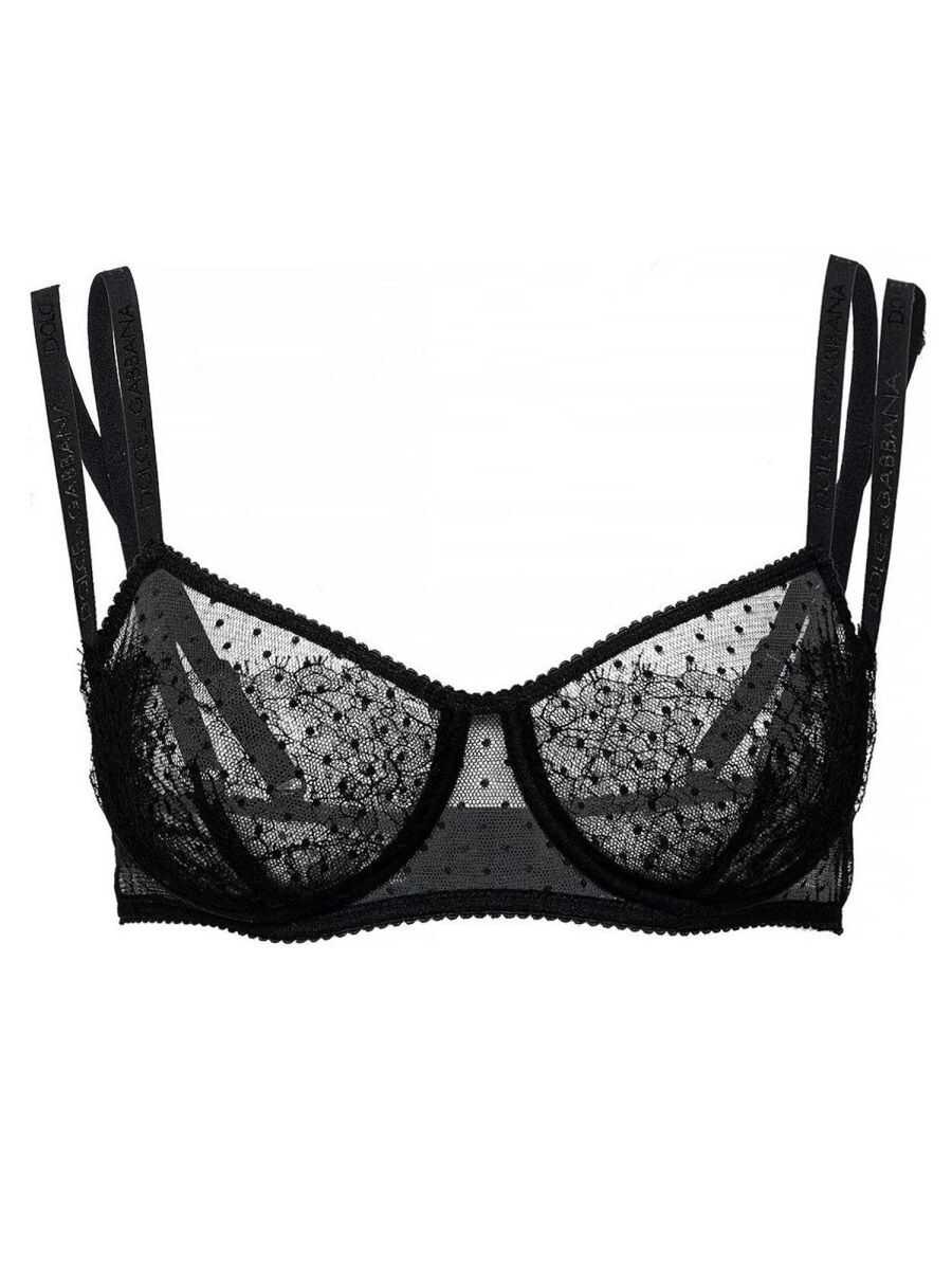 Black point d'esprit tulle underwire cup two logo-embellished shoulder straps adjustable fit concealed rear hook and zip fastening