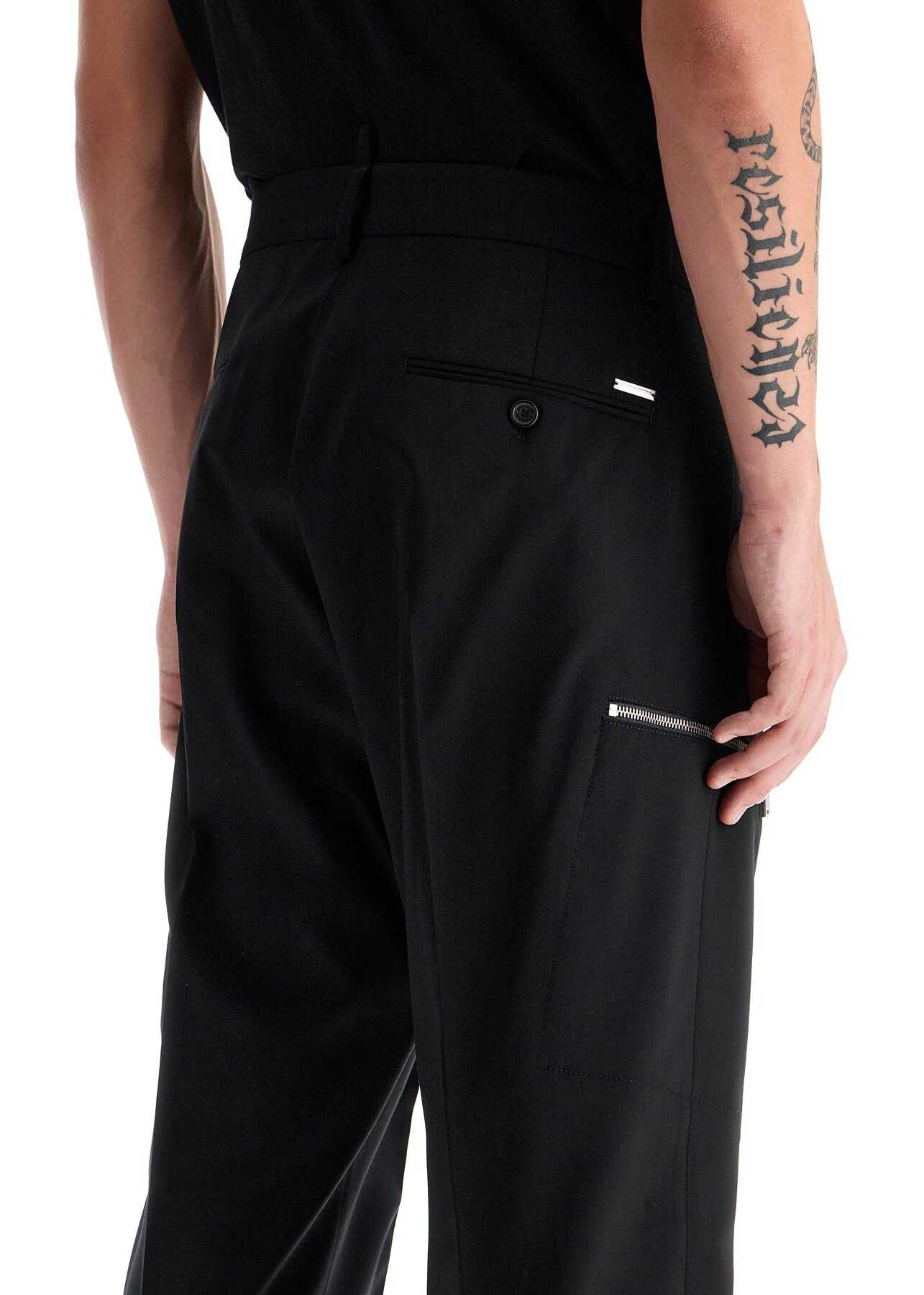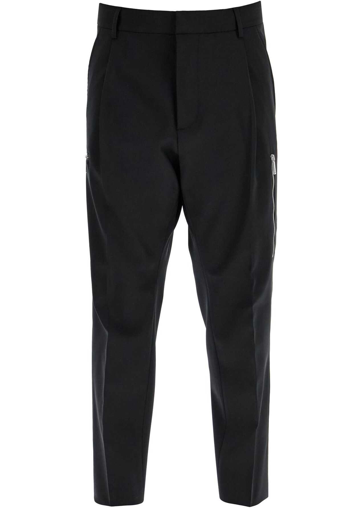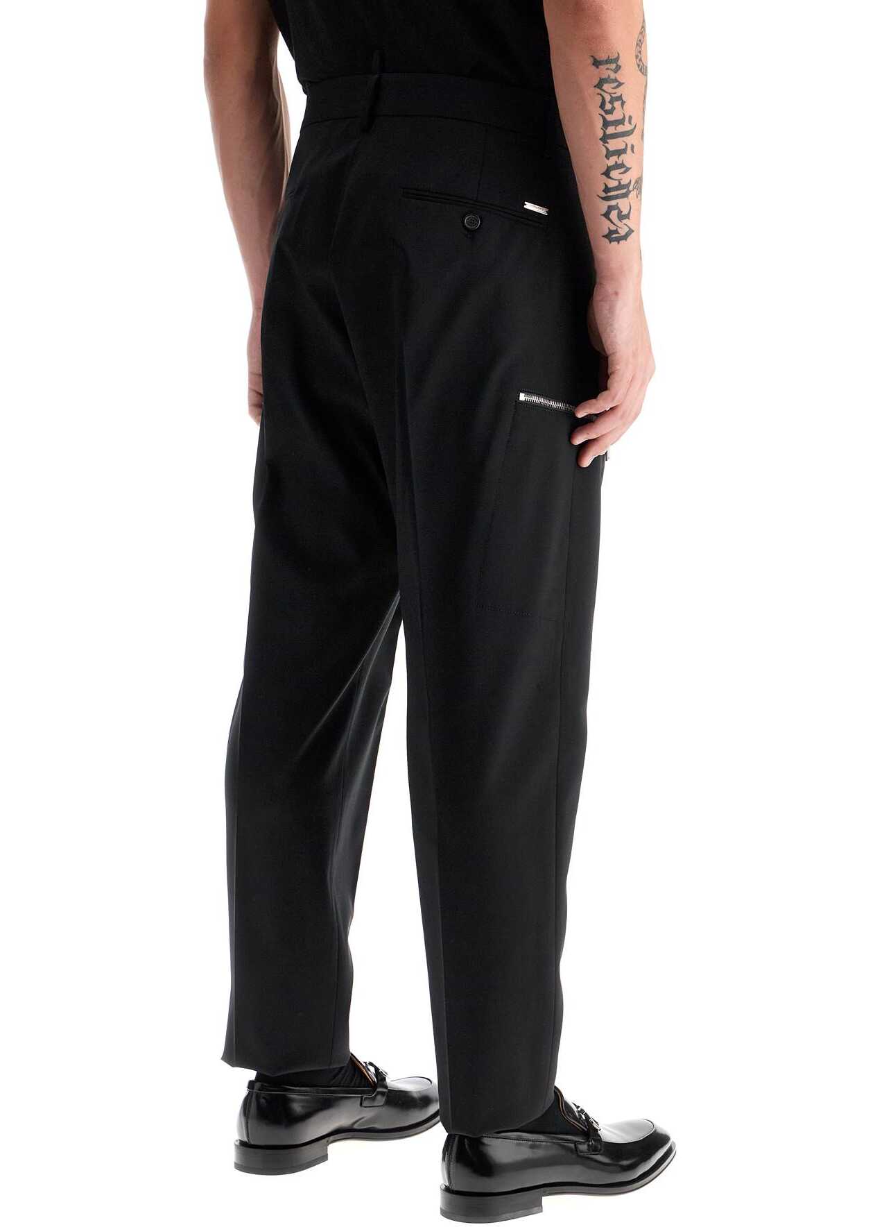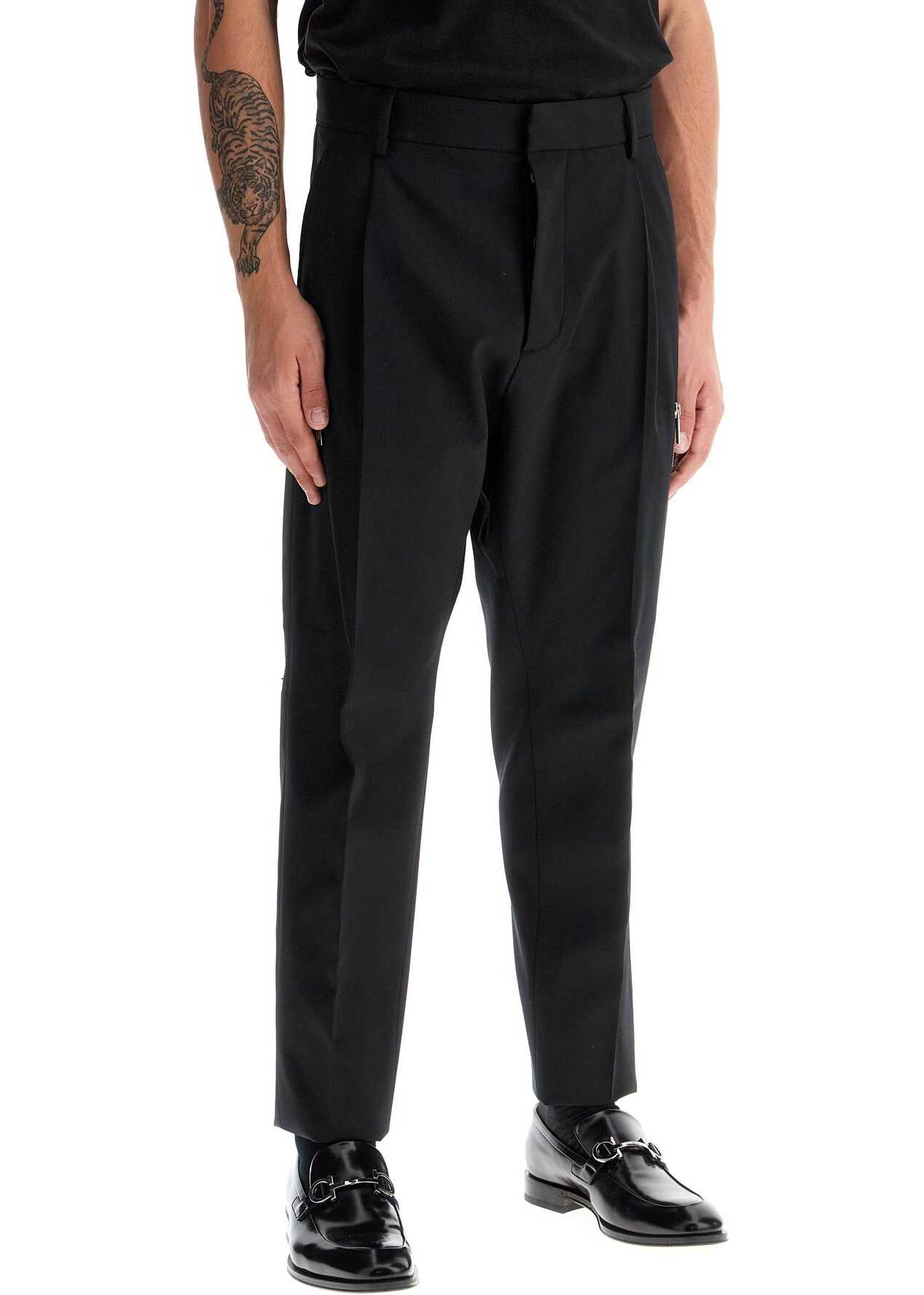 These Dsquared2 tailored trousers are made of stretch wool with a tapered cut and cropped hem. Detailed with a silver metal logo plaque on the back, they feature French pockets, zip and welt pockets on the back, pressed creases, and a front closure with buttons and a hidden hook. The model is 182 cm tall and wears size IT 50.