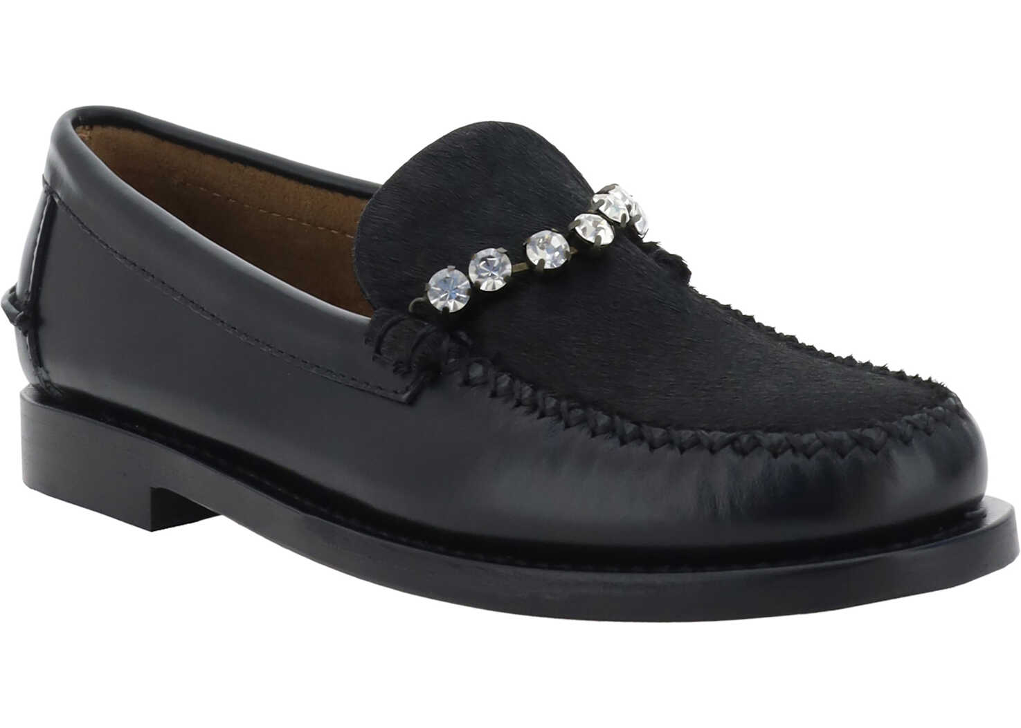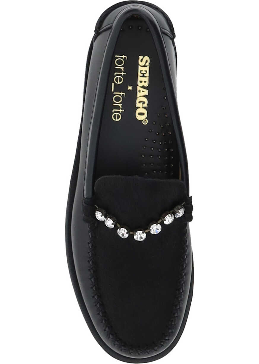 Leather Loafers by Forte_Forte, round toe, shiny appliqué jewels on front, leather block sole, press-stamped logo insole.