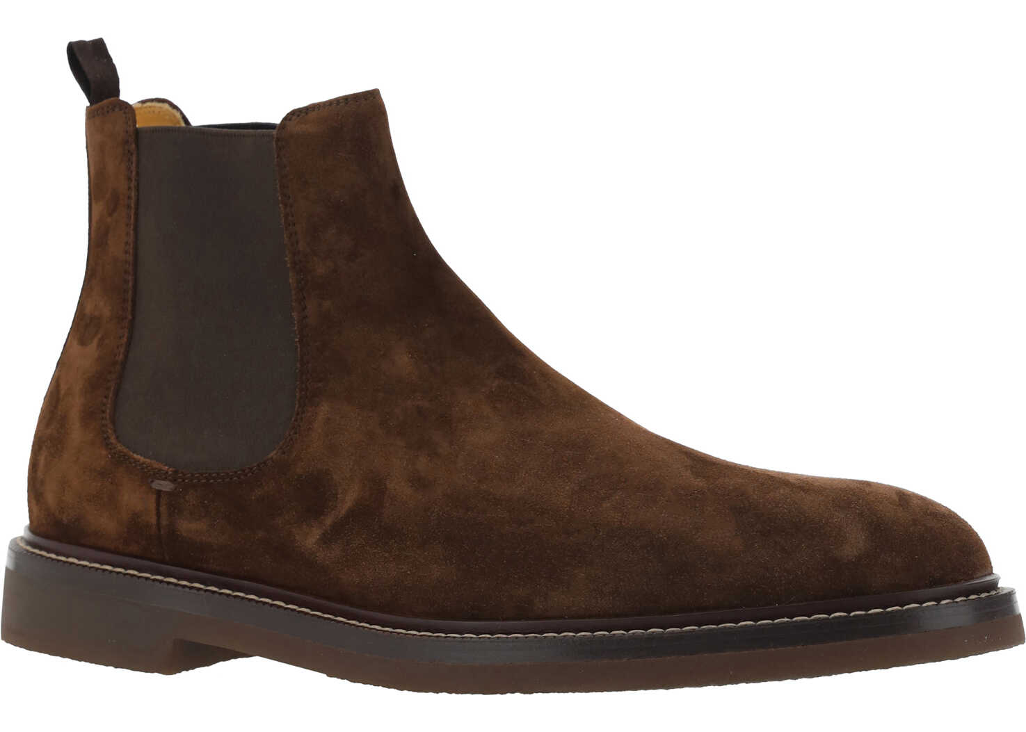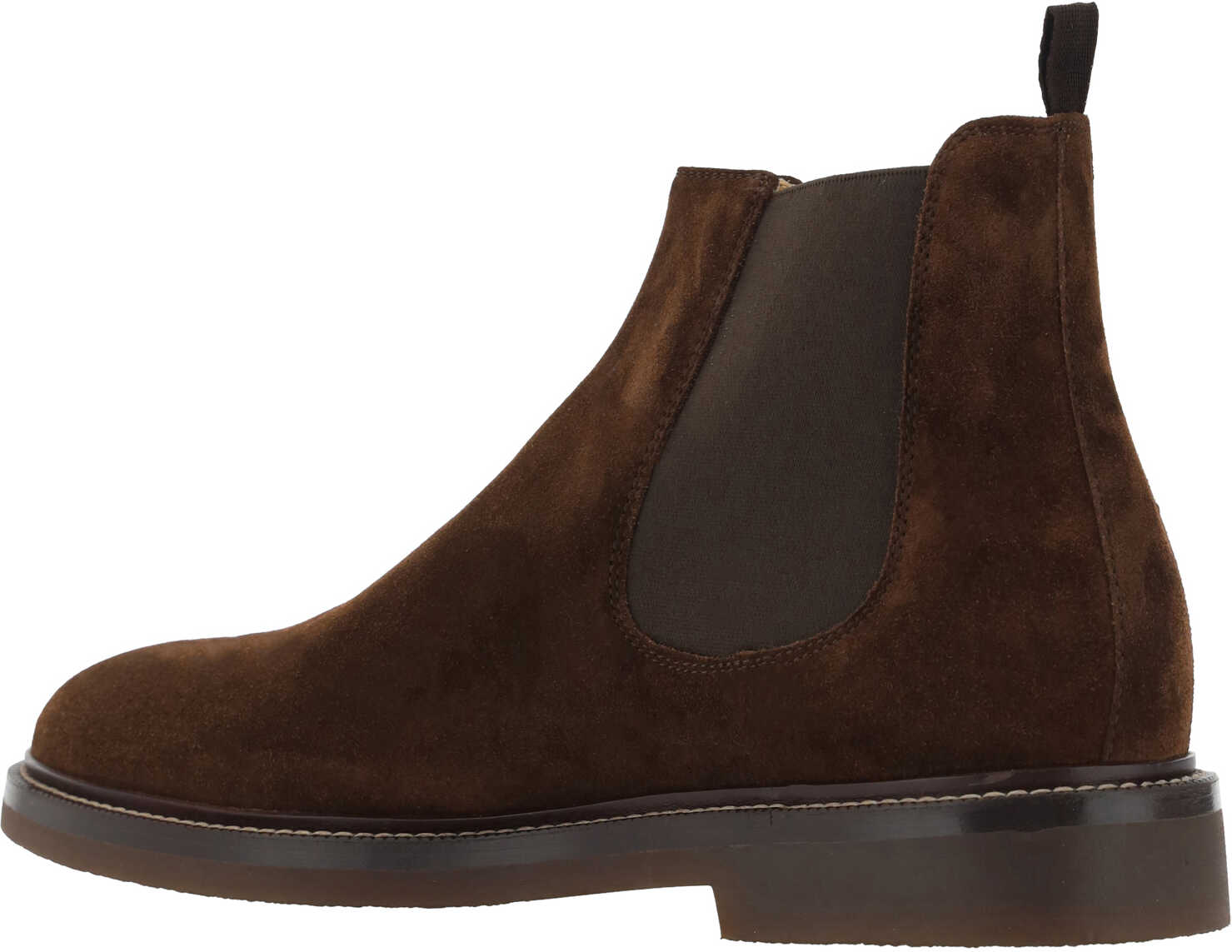 Calfskin Ankle Boots by Brunello Cucinelli, stretch fabric band on side panels, suede design, elongated toe, block heel, contrasting sole, pull-on at back for easy fit.