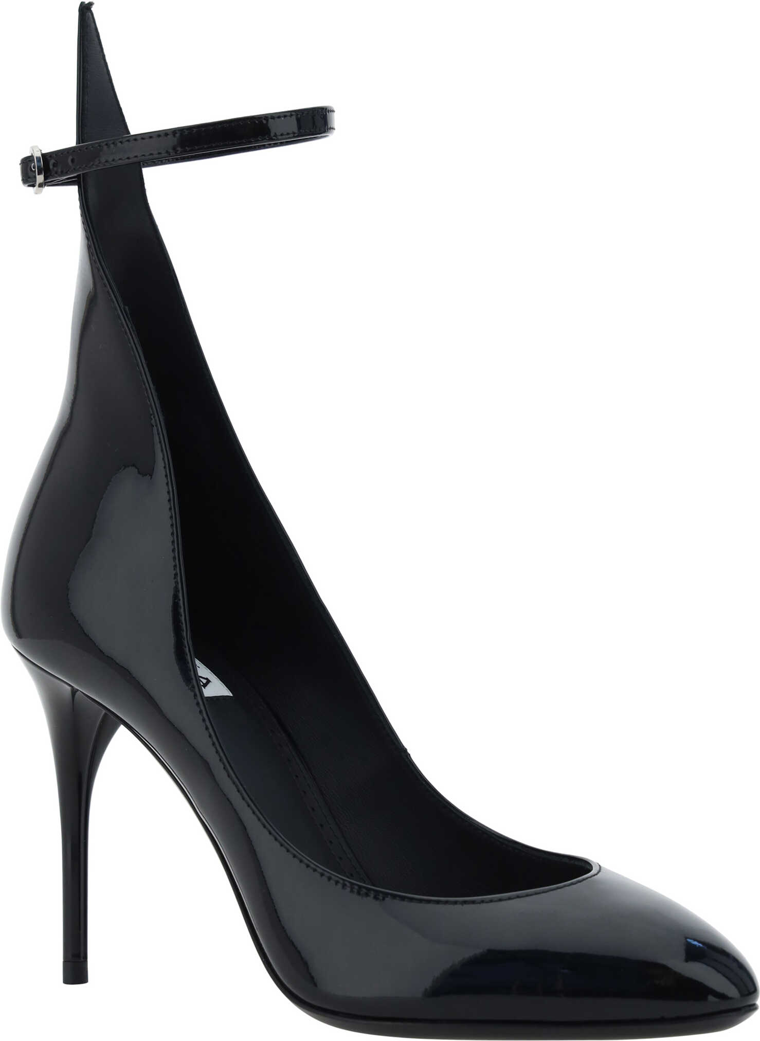 Leather Pumps by Alaïa, varnished leather design, adjustable ankle lap strap with buckle, round toe, high upper with iconic A-shape, leather stiletto heel, contrasting logo insole.