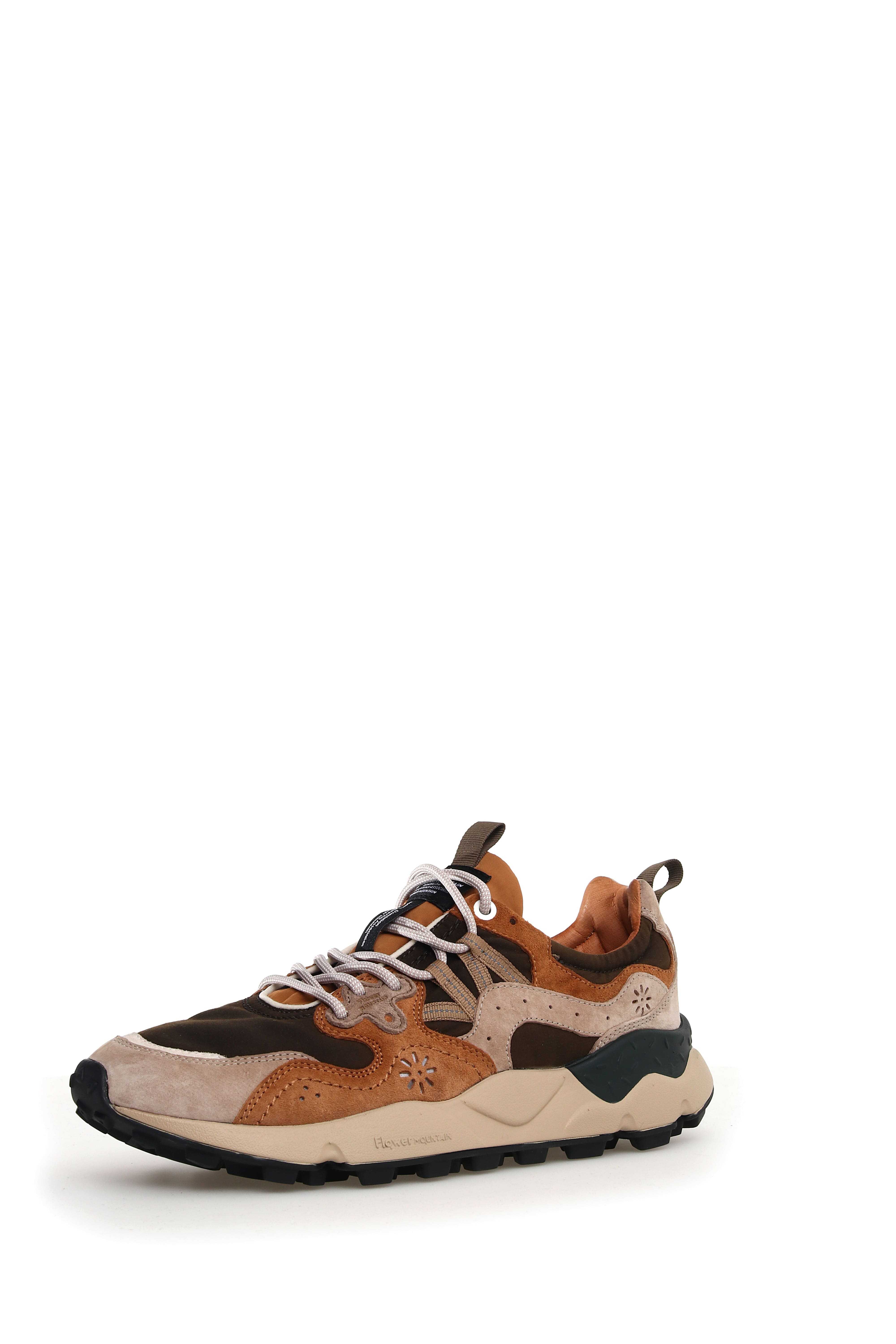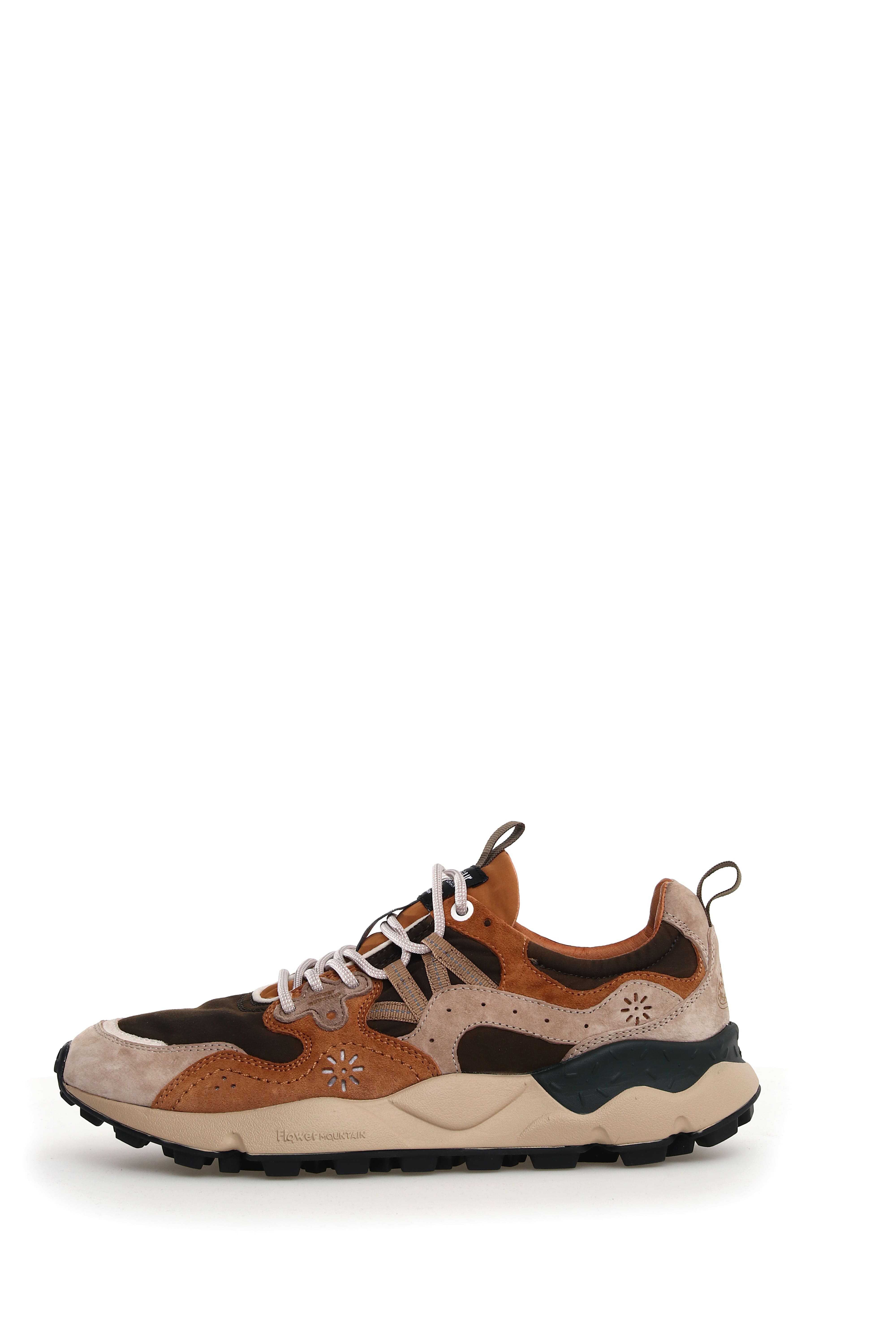 `Flower Mountain sneakers made with suede and waxed technical fabric uppers, with an ultra-light rubber sole and toothed tread, the inner sole is made of antibacterial cork.`