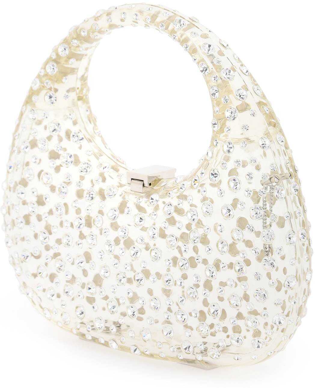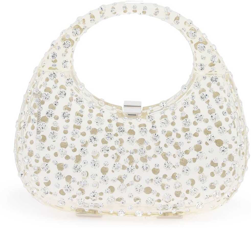 The Meleni handbag by L'ALINGI is made of resin and embellished with all-over crystals. It features a magnetic clasp in engraved silver metal for closure.