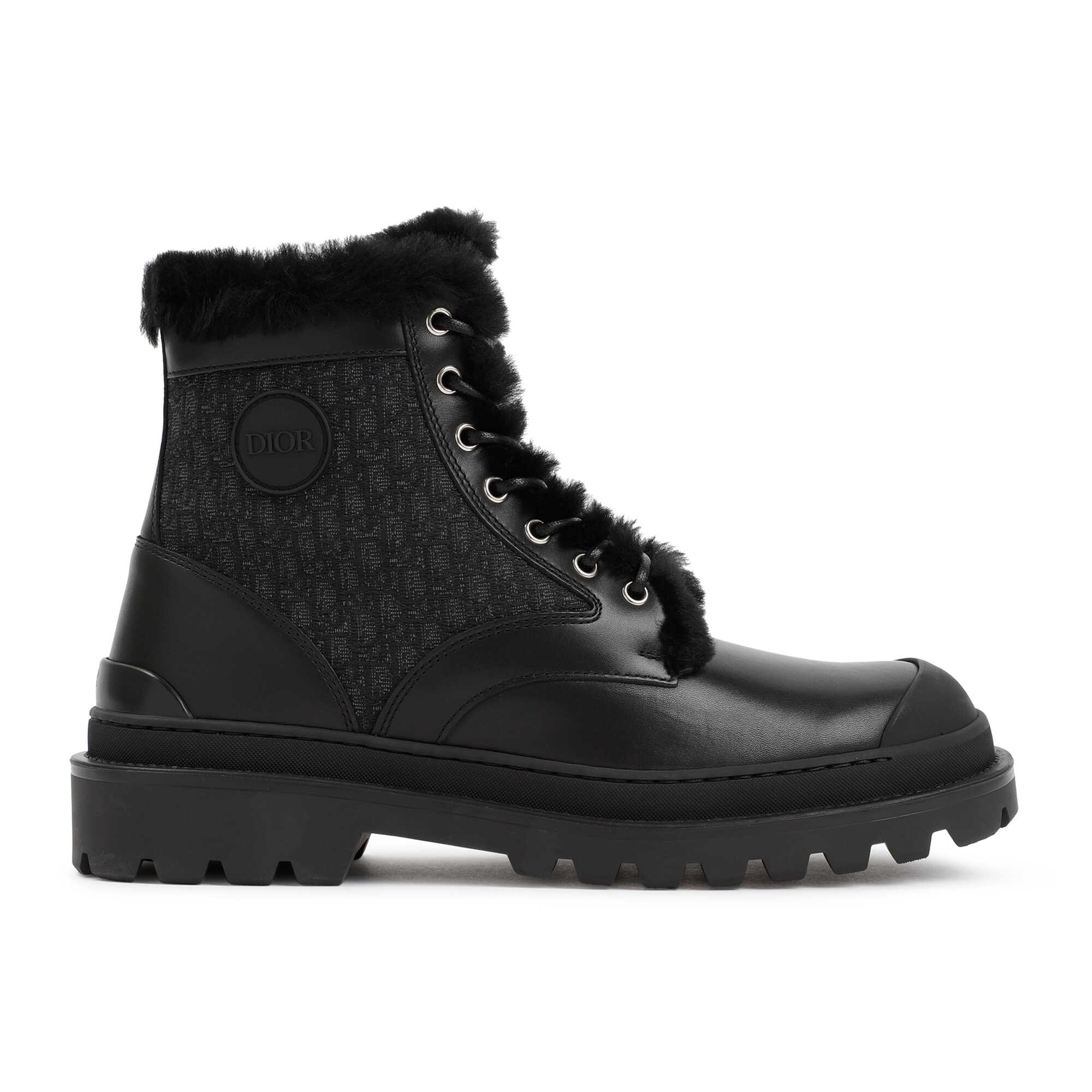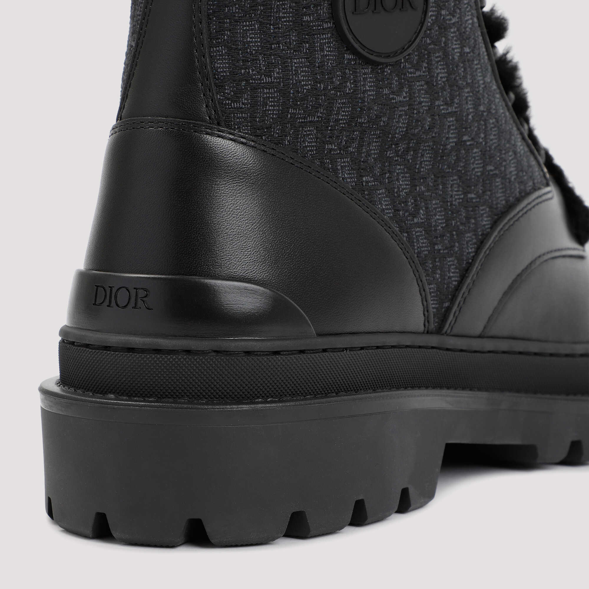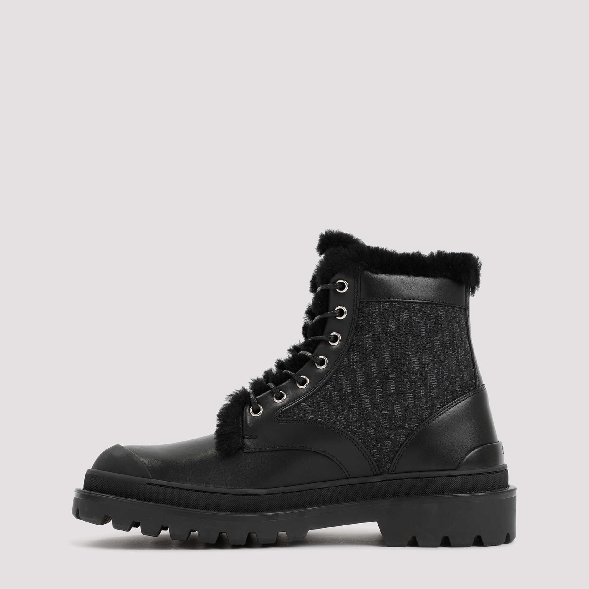 Dior Homme Black Leather and Canvas Boot. Upper crafted in black leather and logoed canvas with a tonal rubber tank sole. Round reinforced toe, front lace-up fastening, ankle length, "Dior" logo patch on the side, embossed "Dior" logo on the heel, furry lining.