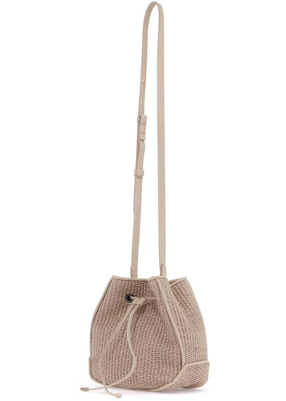 This Brunello Cucinelli bucket bag is made of techno raffia with leather profiles and drawstring. It features an adjustable leather shoulder strap and is adorned with iconic monile details. The interior is lined with a leather credit card slot and the metallic accessories are in ruthenium finish.