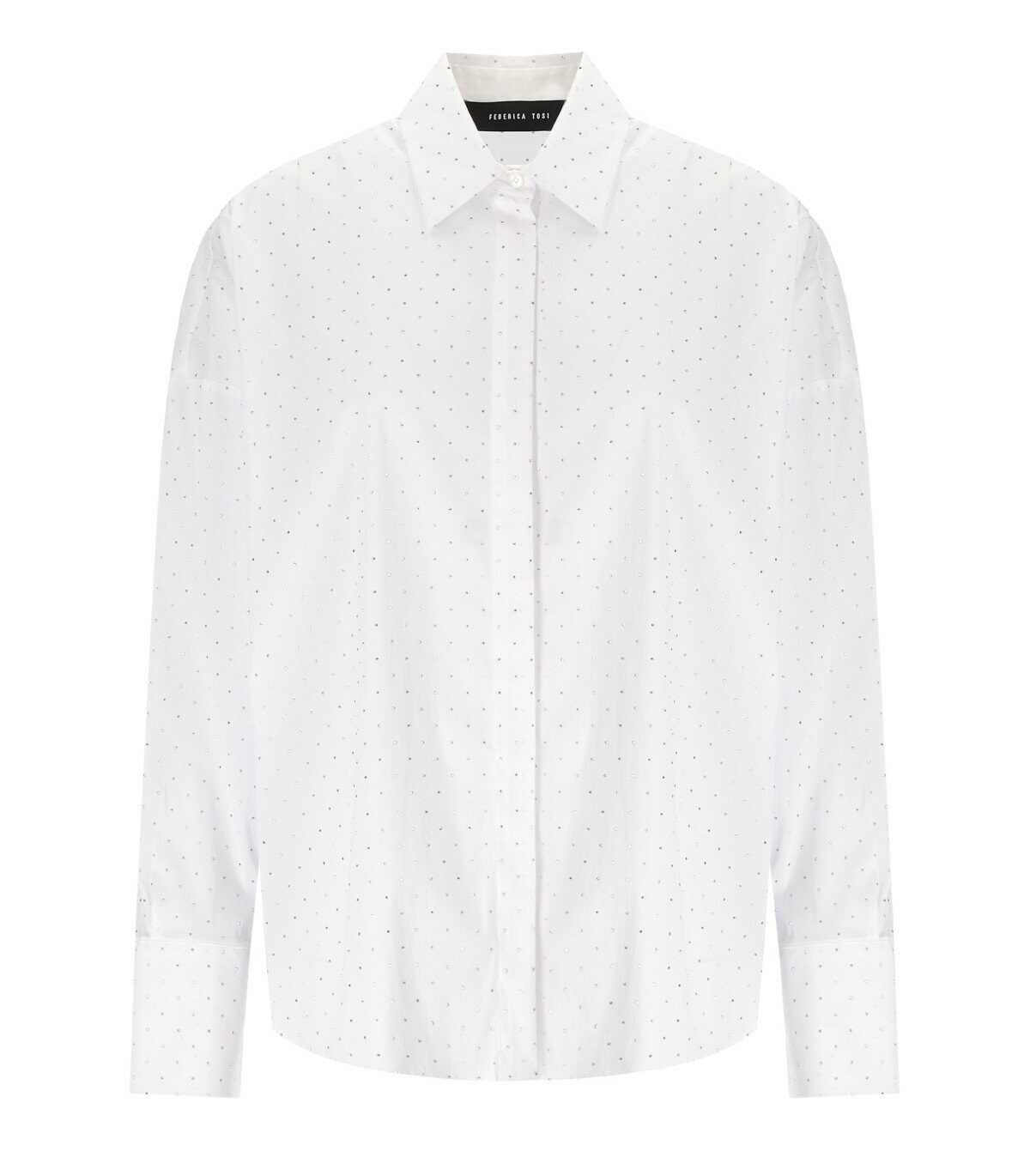 Shirt by Federica Tosi made of white cotton. Characterized by a straight line, it is adorned with rhinestones. Classic collar. Button closure and cuffs.
