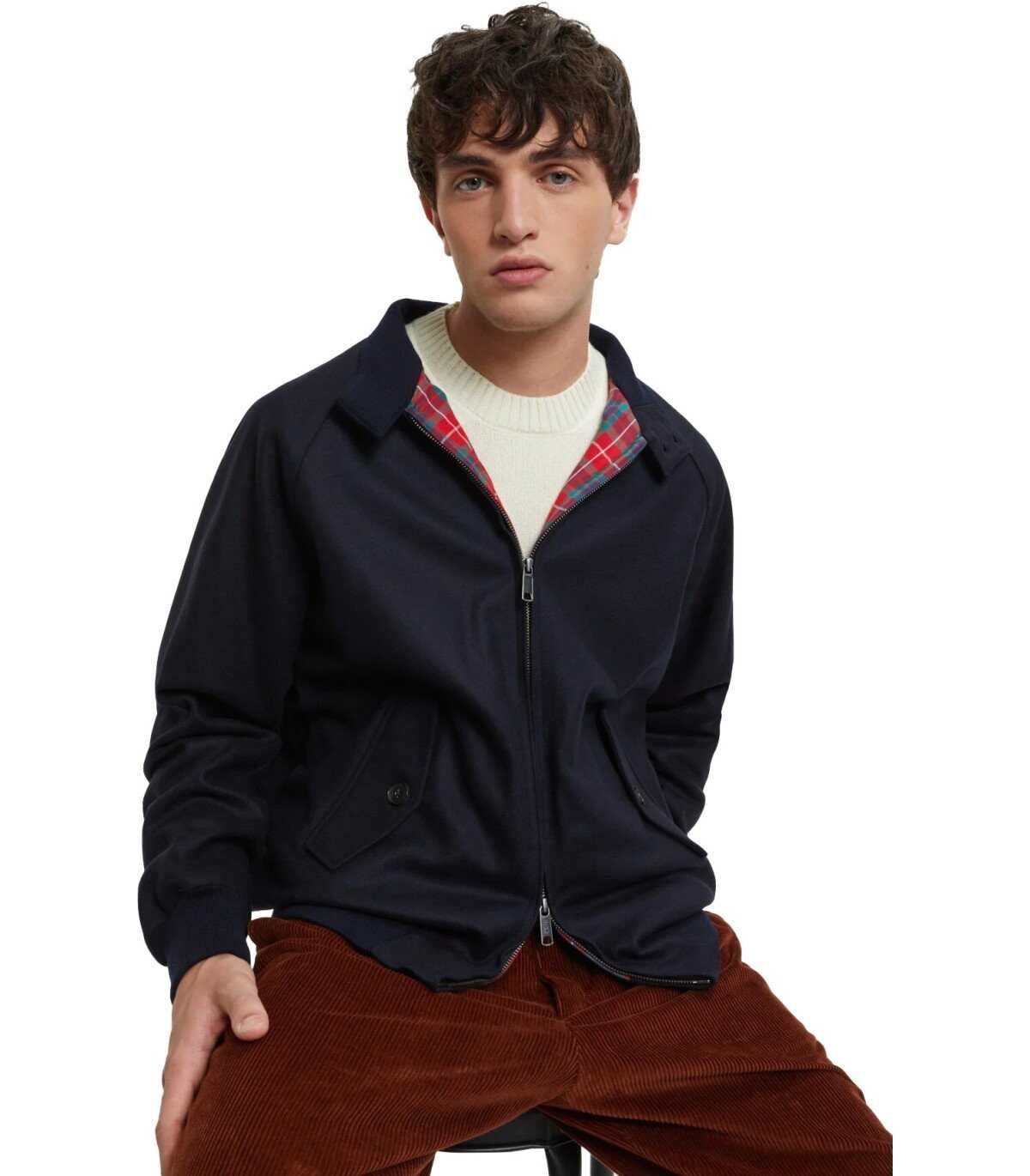 Baracuta G9 Melton bomber jacket made of a virgin wool and cashmere blend in blue. Characterized by a slim fit, despite lacking padding, it offers excellent comfort. Zip closure with double-sided logo. Long raglan sleeves for greater movement. Diagonal front pockets with single button closure. Internal fabric pocket with button closure. Cuffs and waistband with tone-on-tone logo in ribbed texture. Internal lining in Fraser Tartan.