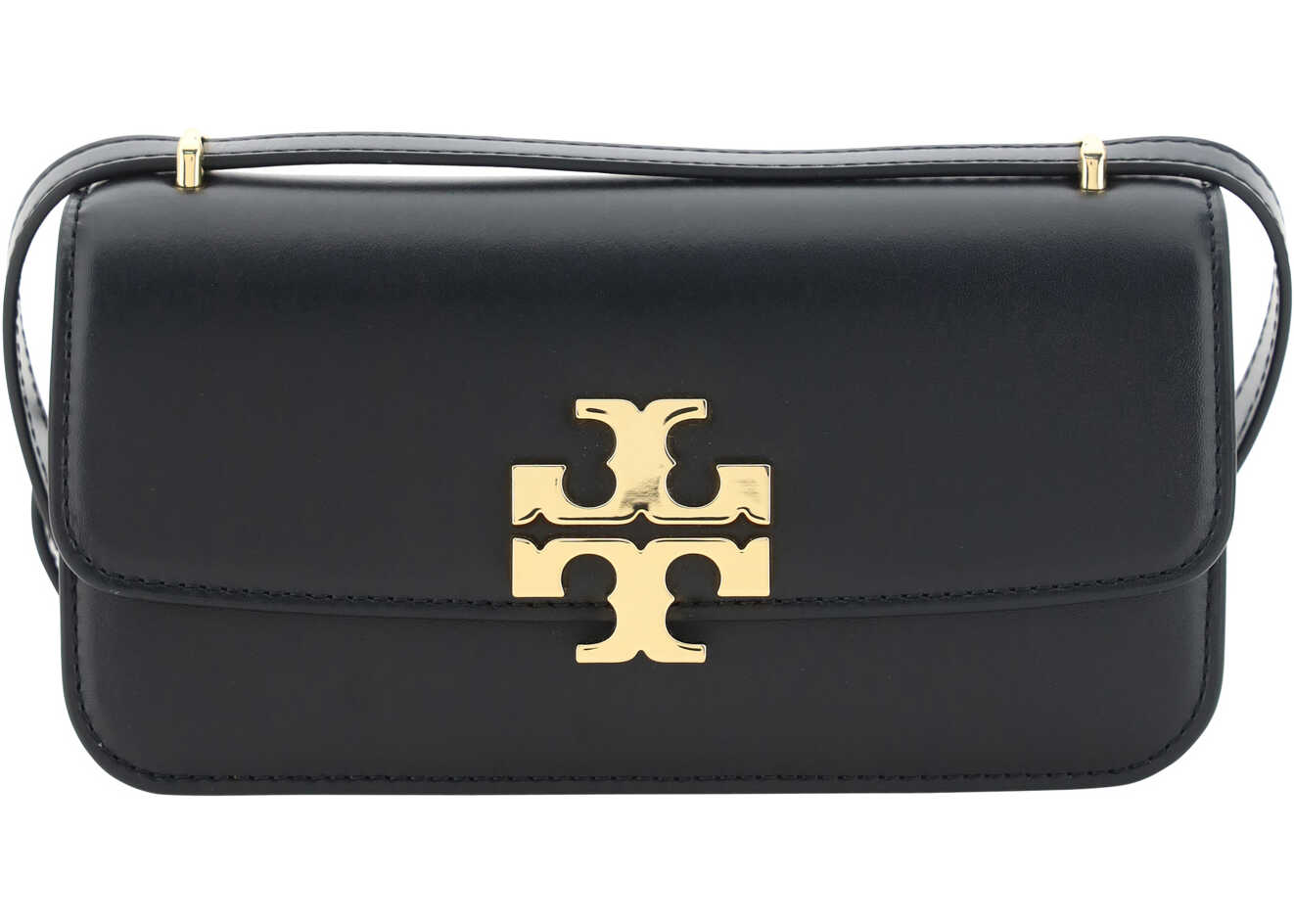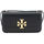 Leather Eleanor Small Shoulder Bag by Tory Burch featuring iconic brand logo on contrasting front, adjustable flat leather shoulder strap, magnetic front opening, interior zippered slit pocket, single interior compartment.
