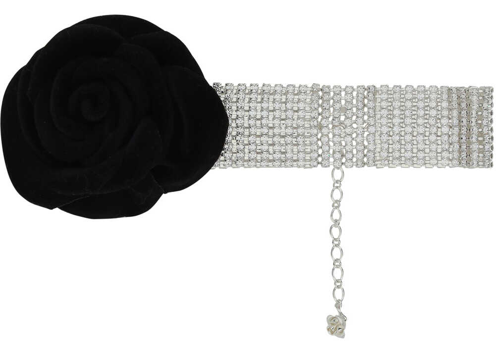 Necklace by Magda Butrym, choker model embellished with all-over appliquéd shiny jewels, three-dimensional velvet rose applied on the front.