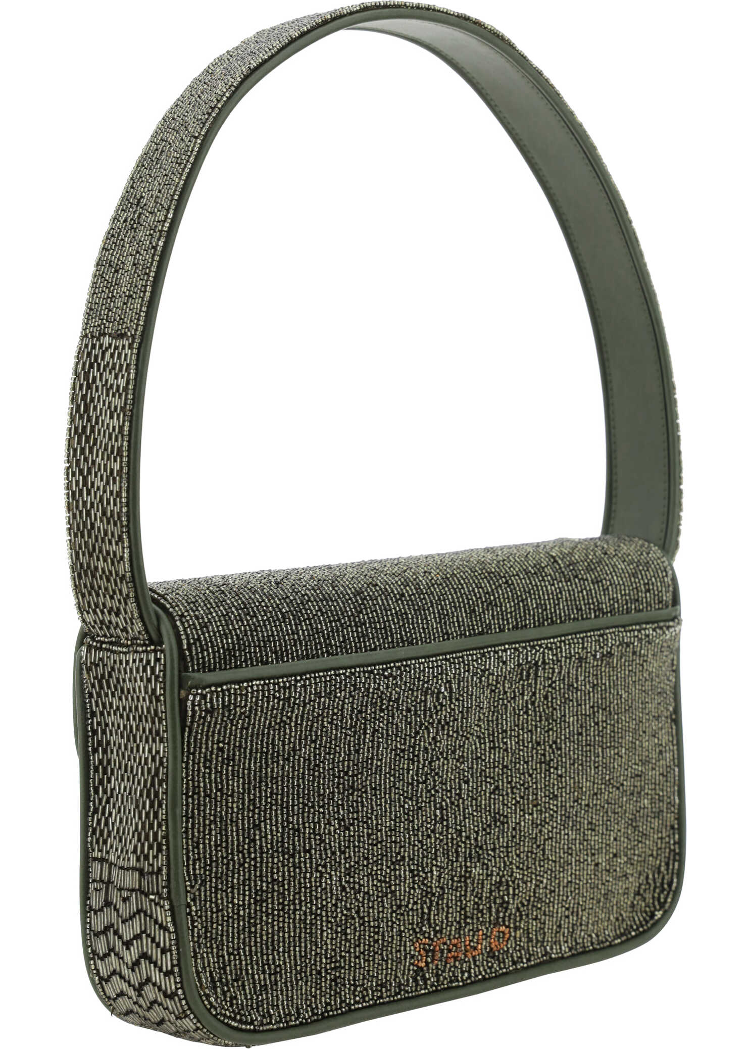 Tommy Handbag by Staud, flat top handle, magnetic button closure on front, one zipper pocket inside, one compartment inside, one pocket outside, all-over embroidered beads, iconic brand signature embroidered with contrasting beads.