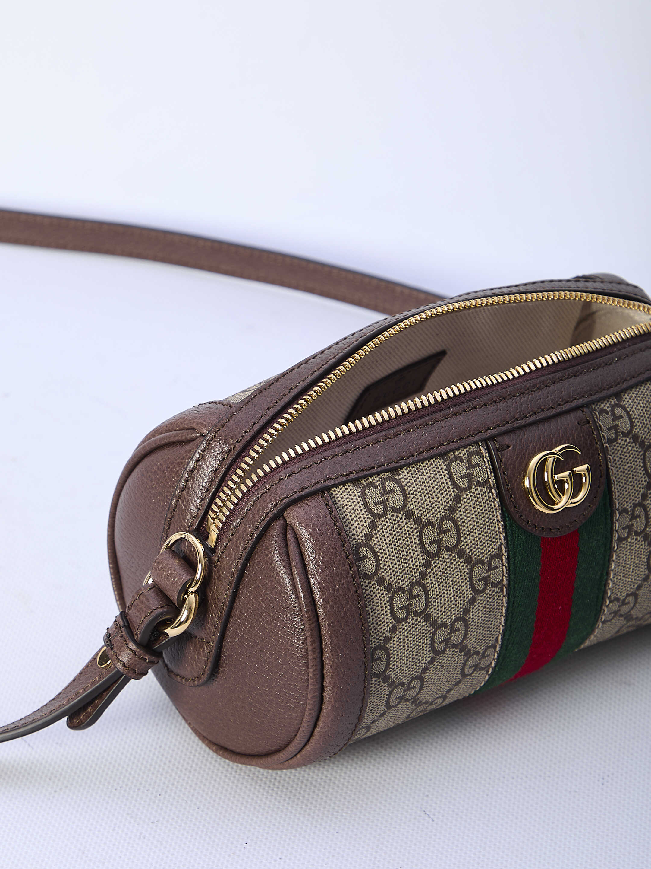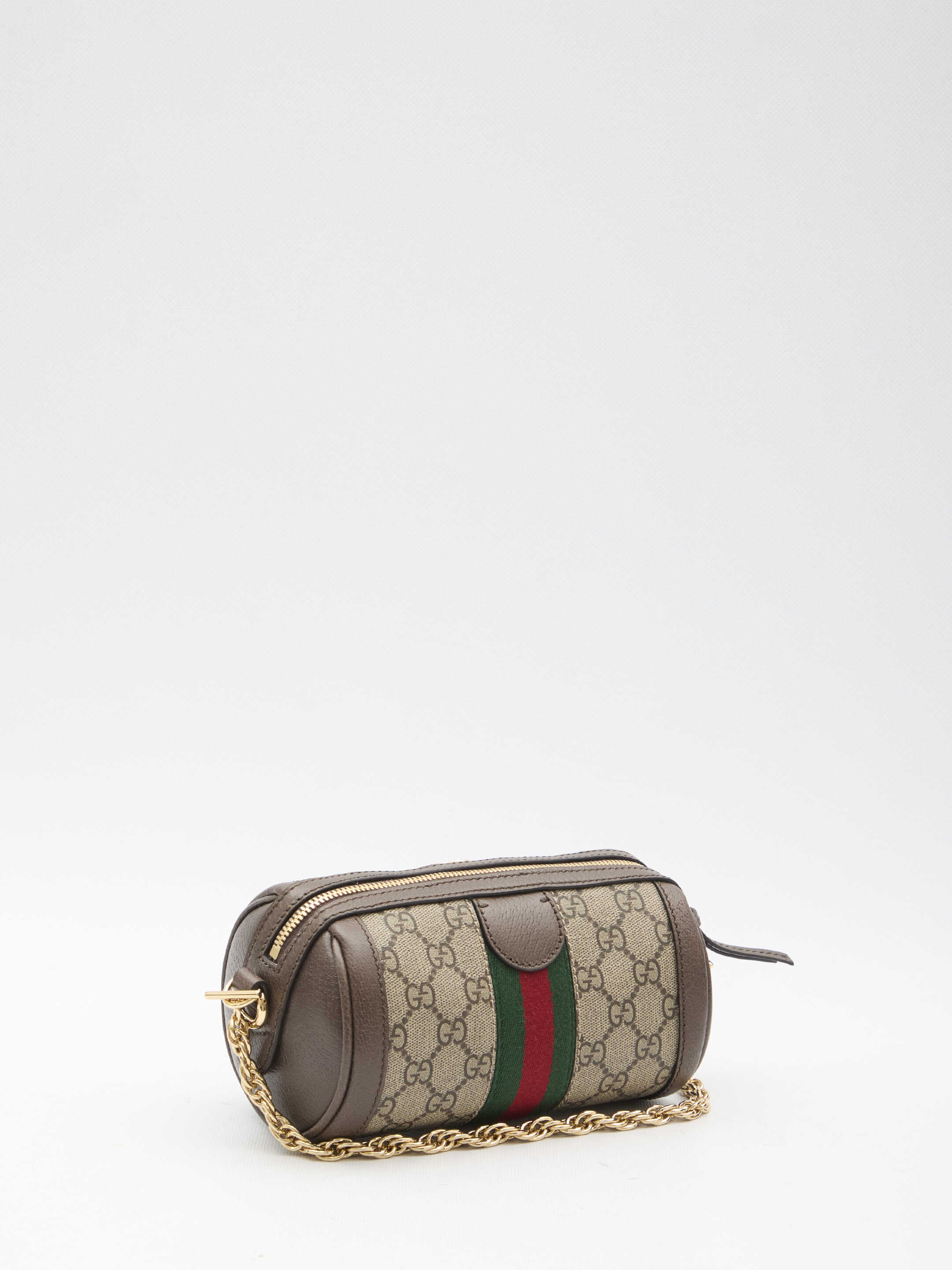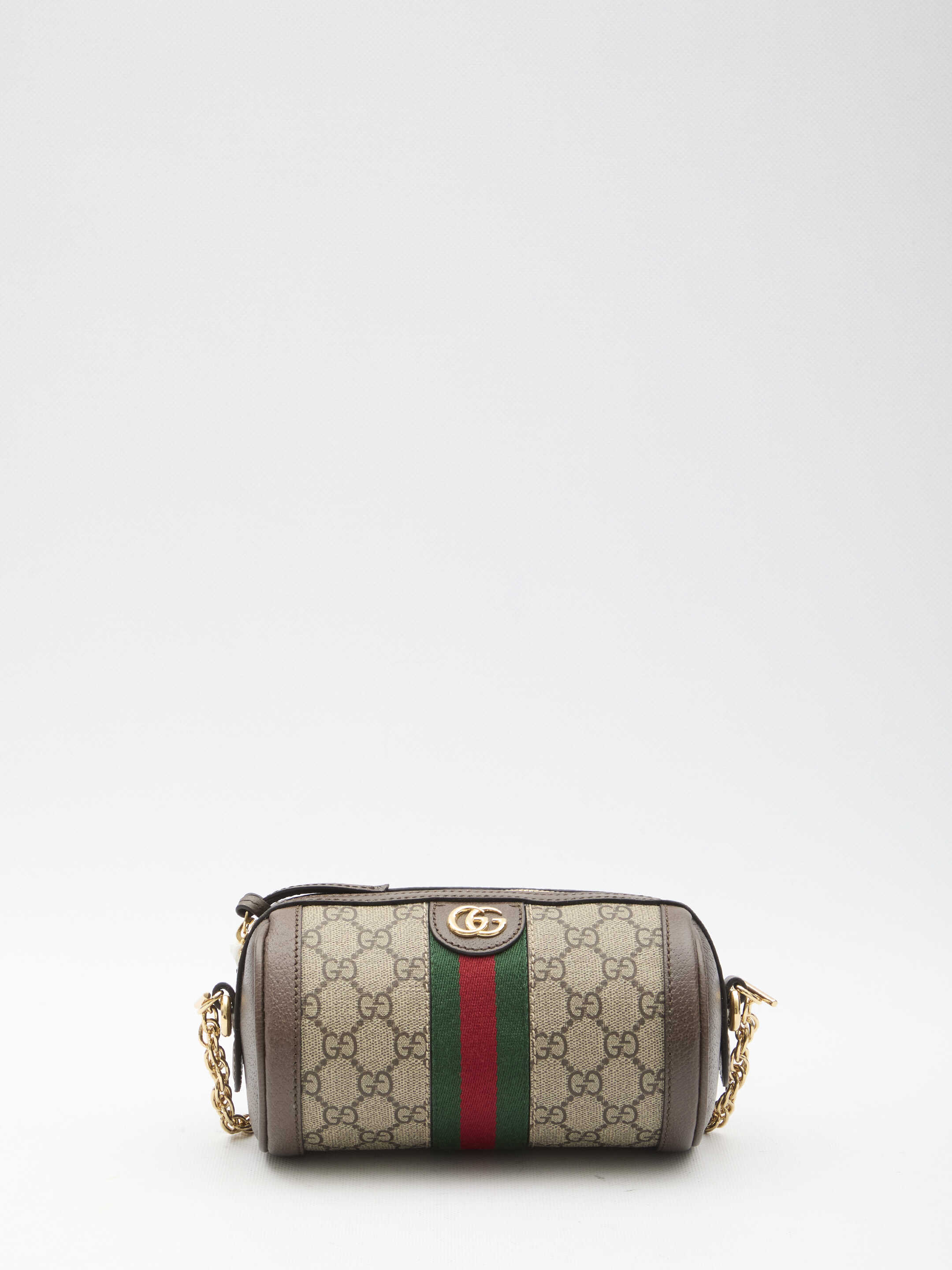 Mini Ophidia shoulder bag in beige and ebony GG Supreme canvas with brown leather trims. It features green and red Web detail, Double G in gold-tone metal on the front, detachable chain shoulder strap, adjustable and detachable leather shoulder strap, zip closure and one main interior compartment. Cotton linen lining.