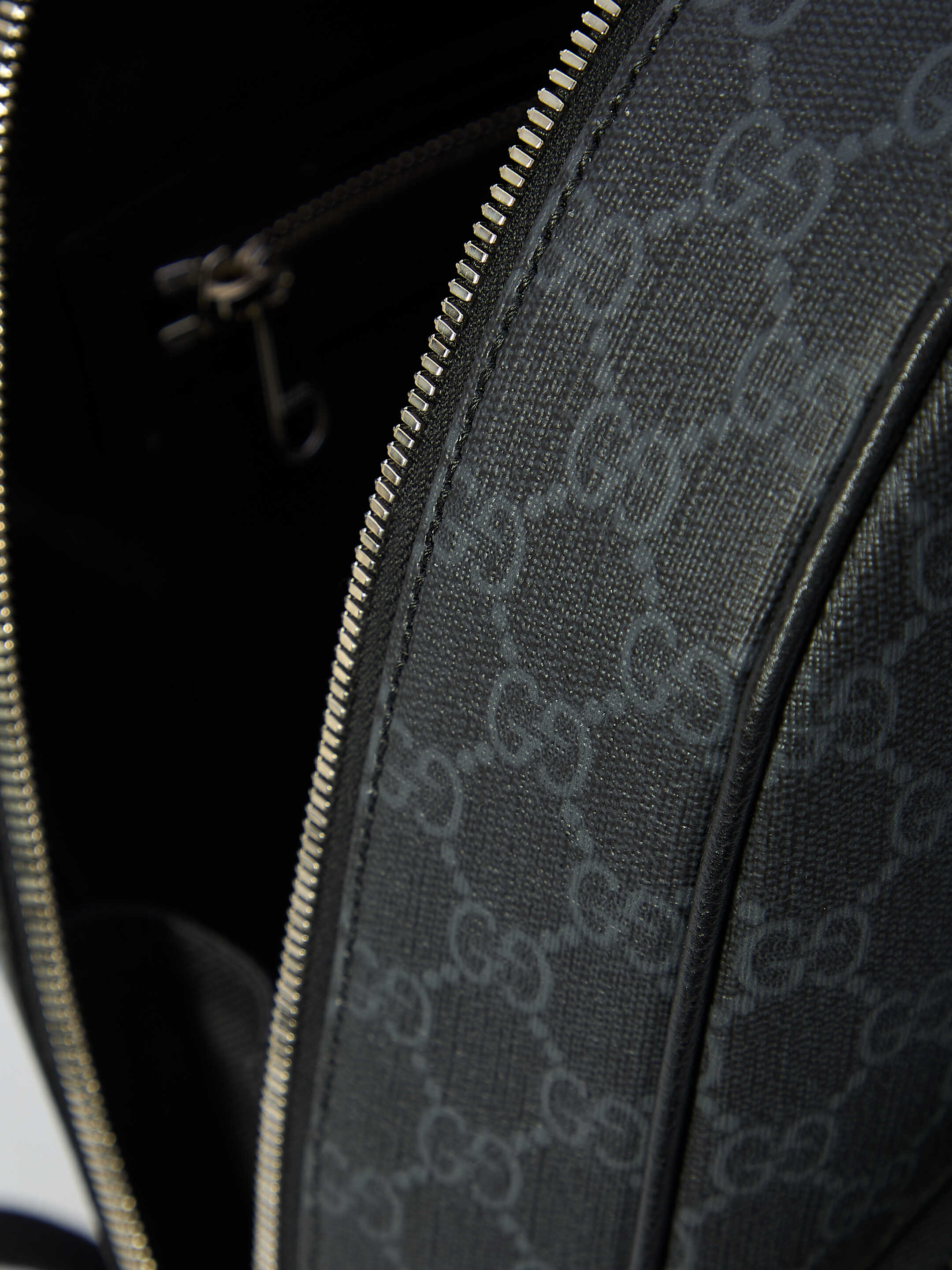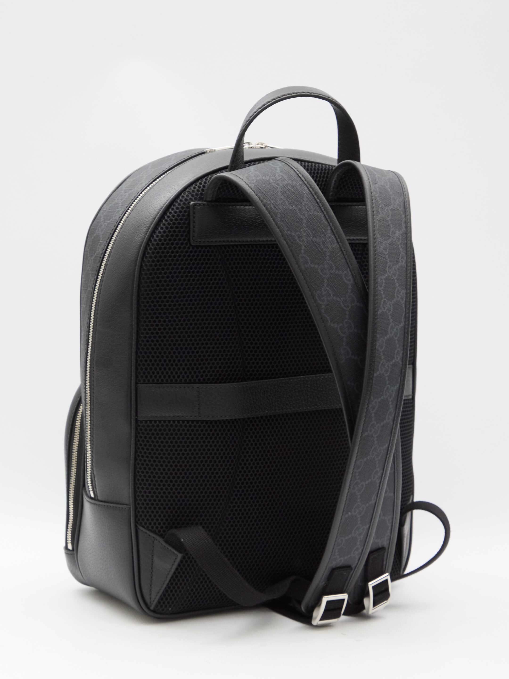Medium GG backpack in black GG Supreme canvas with black leather trims. It features Gucci Made in Italy tag on the front, fixed top handle, adjustable shoulder straps, one front zip pocket, two-way zip closure, one main interior compartment and one interior zip pocket. Cotton linen lining. Any leather imperfections are not to be considered manufacturing defects, but a peculiarity of the material.