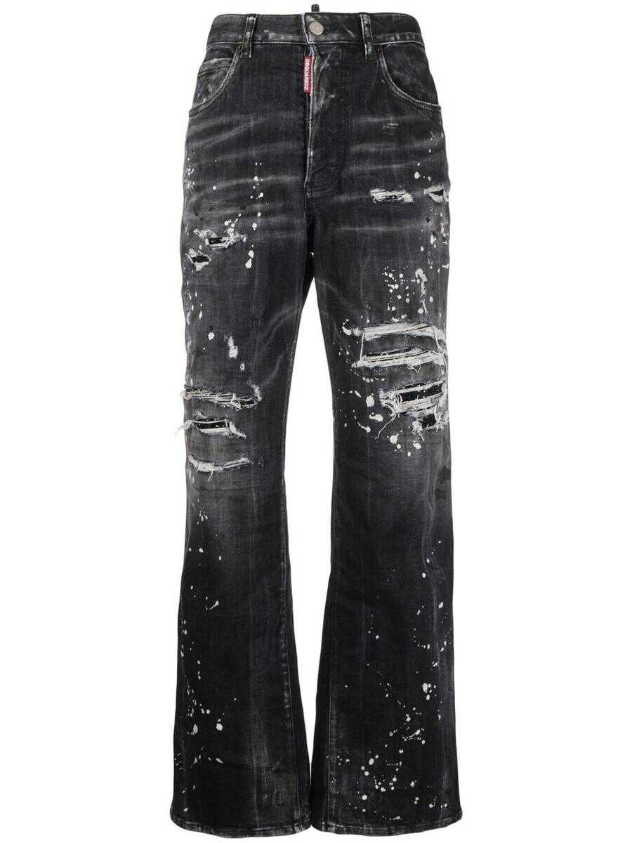 distressed bootcut jeans from DSQUARED2 featuring black, cotton blend, distressed effect, paint splatter detail, belt loops, front button fastening, classic five pockets and bootcut.