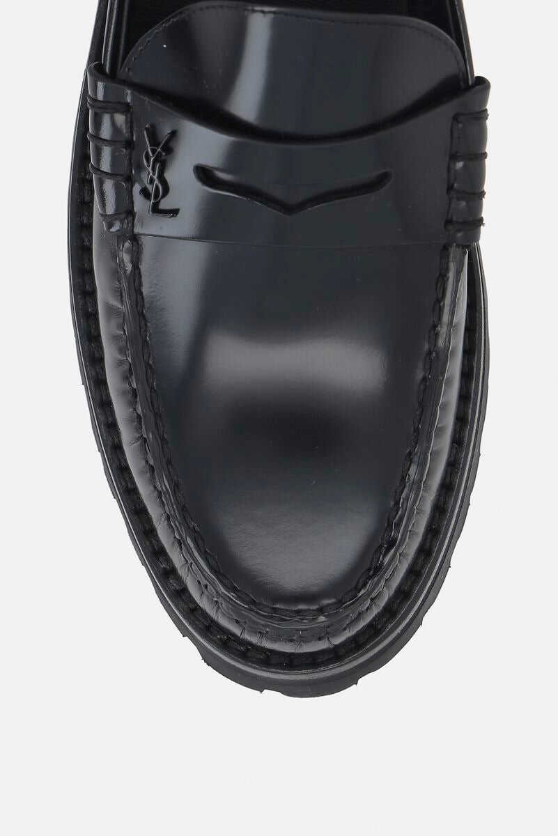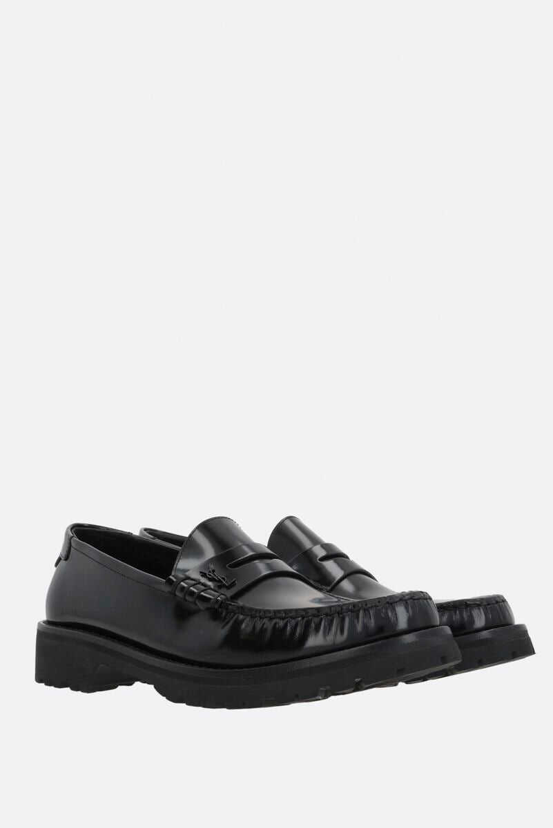 Saint Laurent's loafers crafted in black shiny leather. Featuring an almond-toe silhouette, leather lining and lug rubber sole. The design is completed by the unmistakable logo embossed at heel and metal interlocking YSL signature on side.