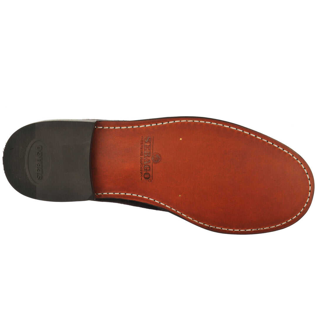 Sebago suede oiled and waterproof moccasin, hand-stitched, unlined upper, leather insole, rubber-molded heel and leather sole.
