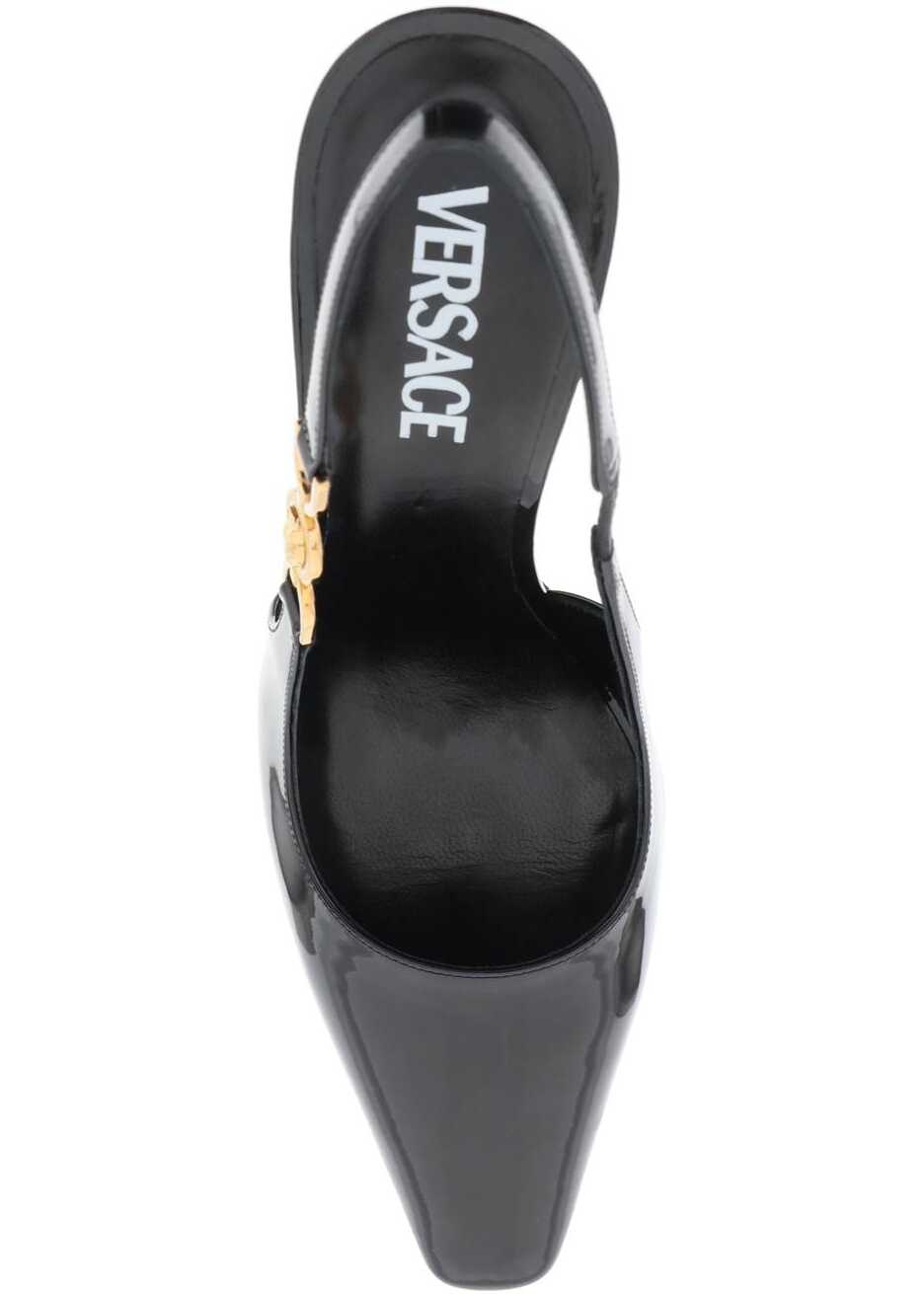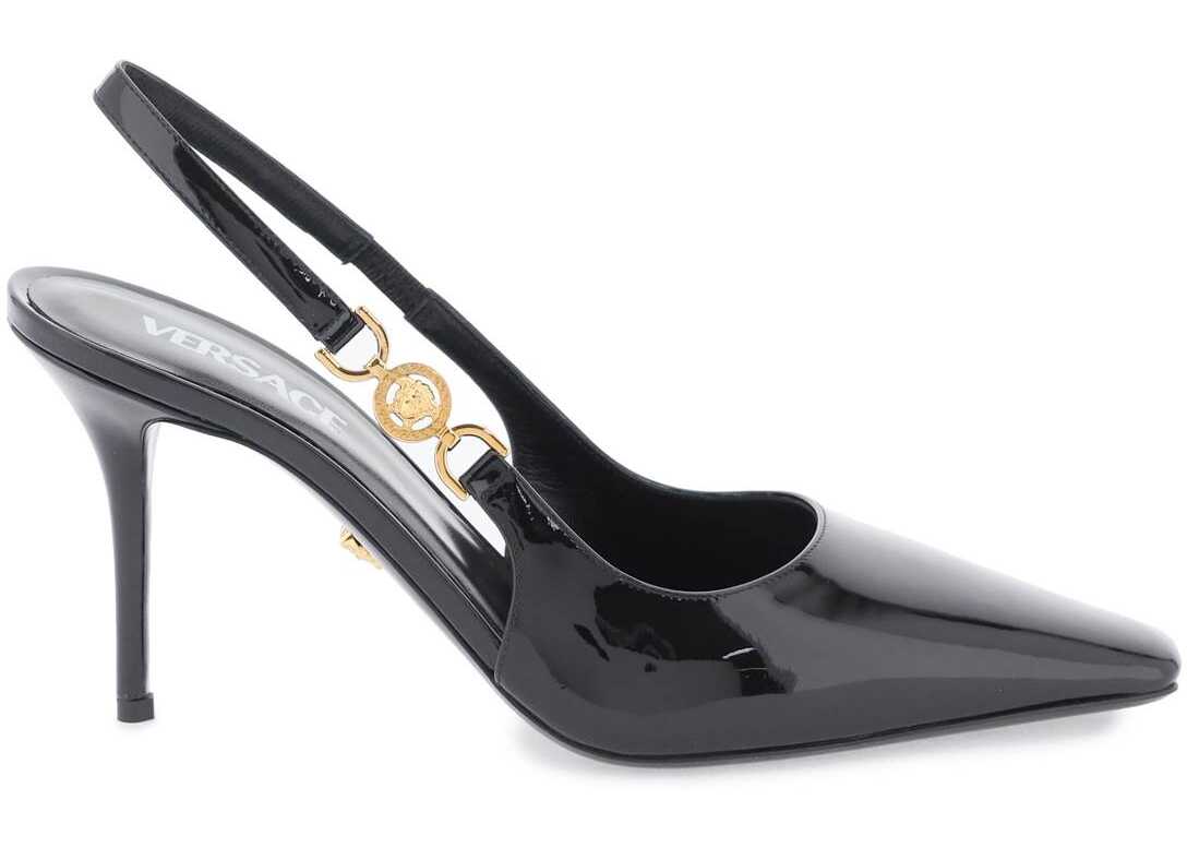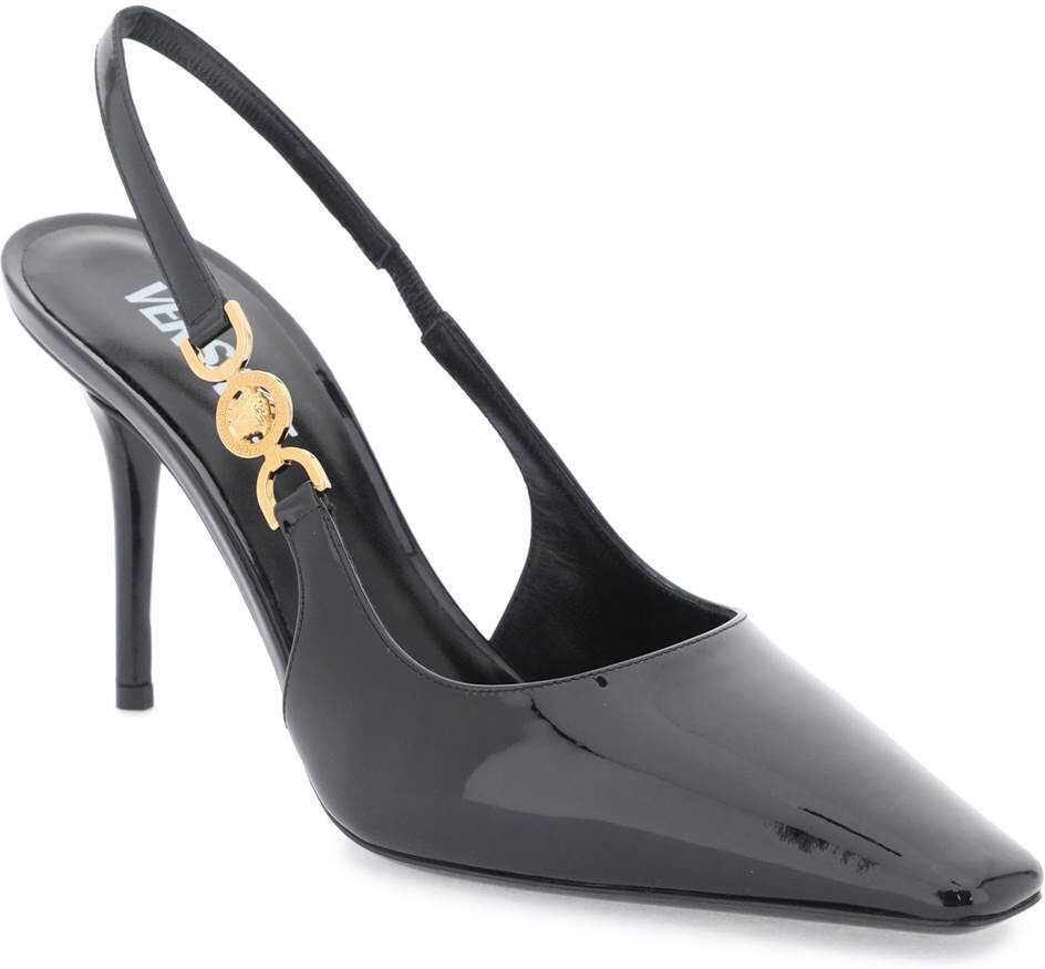 Versace patent leather slingback pumps with square toe and gold metal Medusa '95 detail. Leather footbed and leather sole.