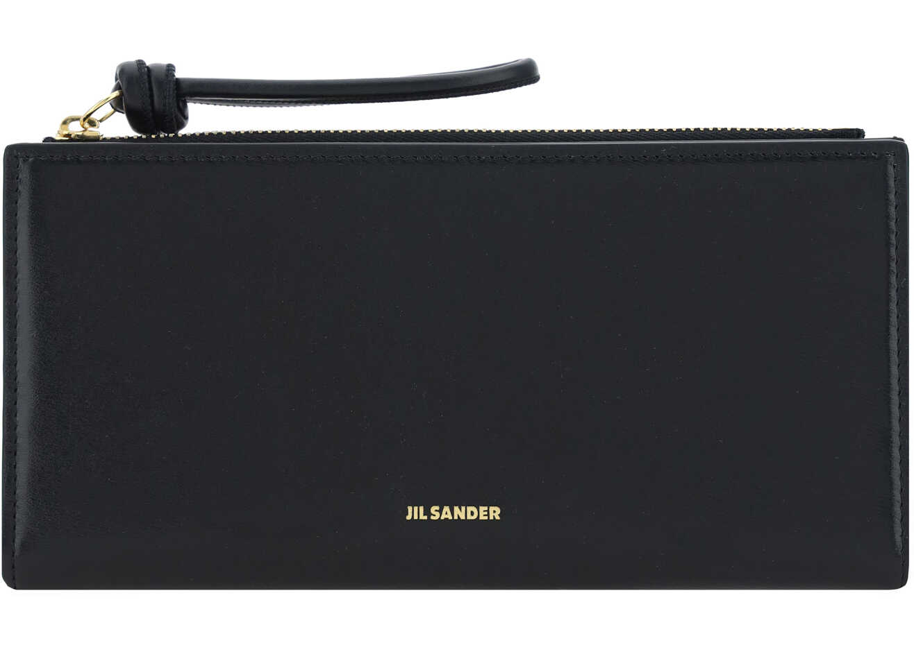 Calfiskin Wallet by Jil Sander, billfold design, zippered coin pocket for closure, card slot inside, interior bill compartment, snap button closure, wrist strap detail, iconic brand monogram printed in contrasting pressure on front.