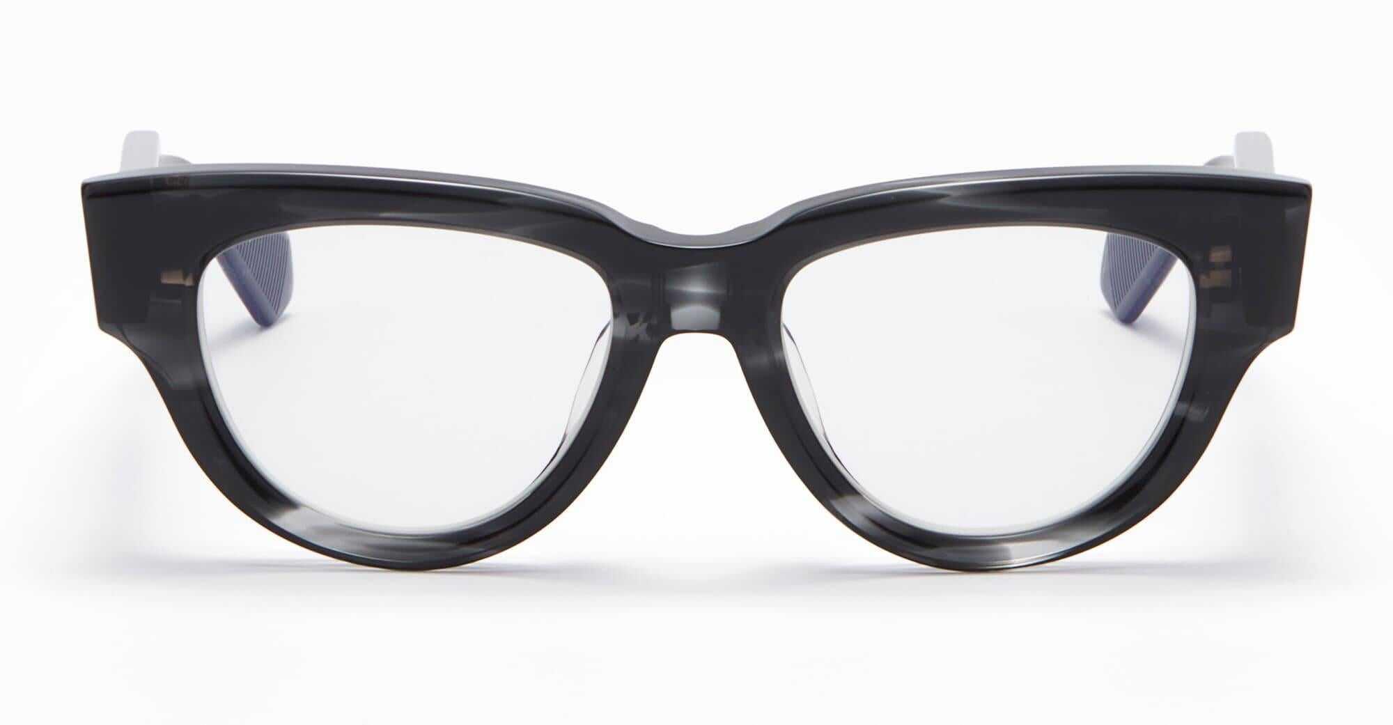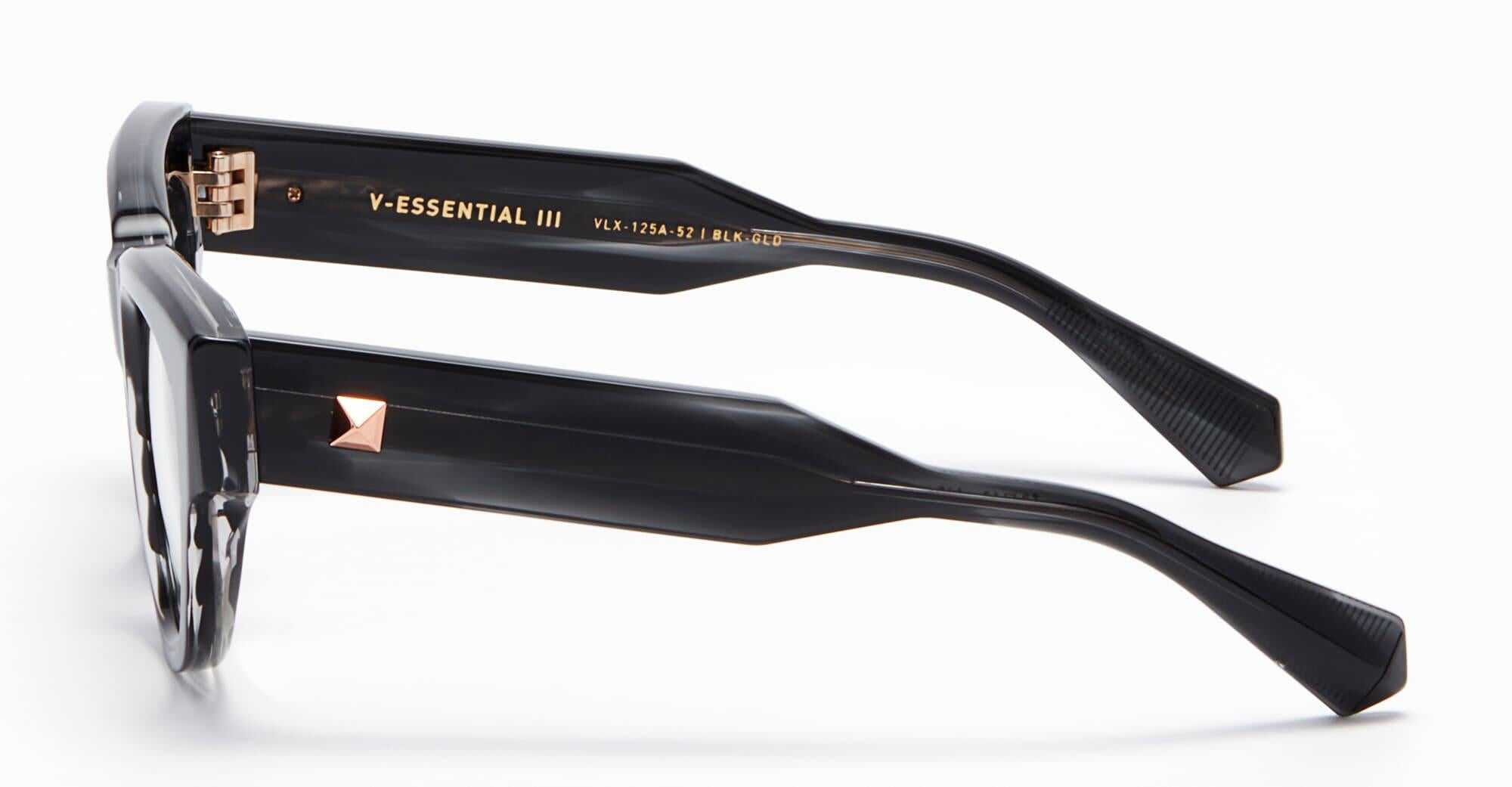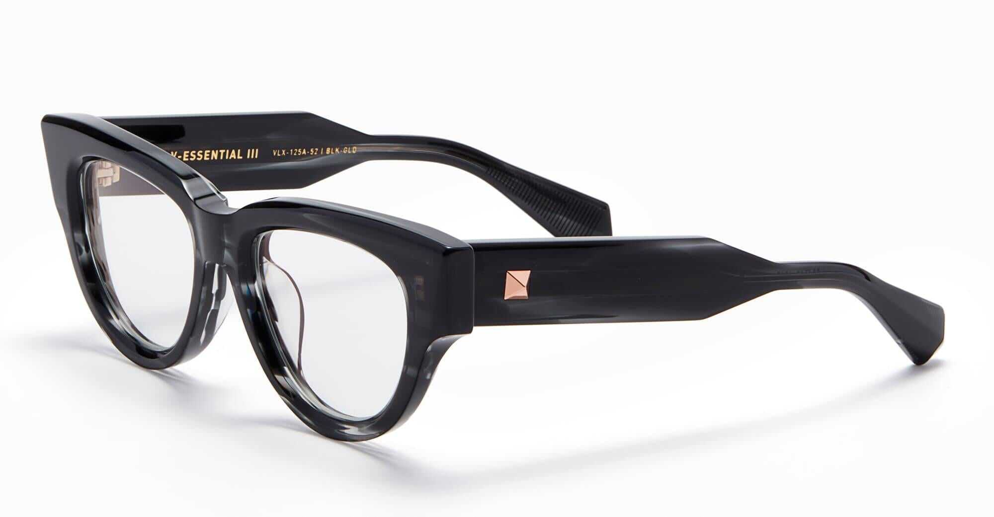 Valentino V-ESSENTIAL III - BLACK SWIRL RX (VLX-125A-52) are subtle cat-eye eyeglasses with a bold classic design. They feature black swirl Japanese acetate frame, iconic Valentino 3D stud pins on temples and semi-exposed titanium core.