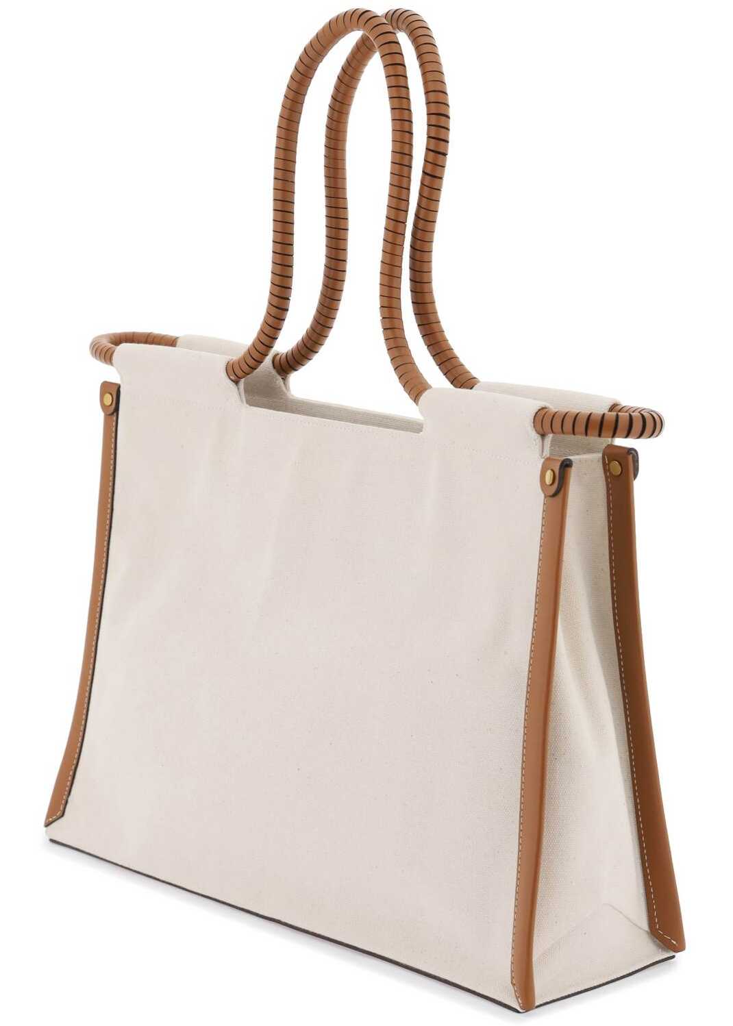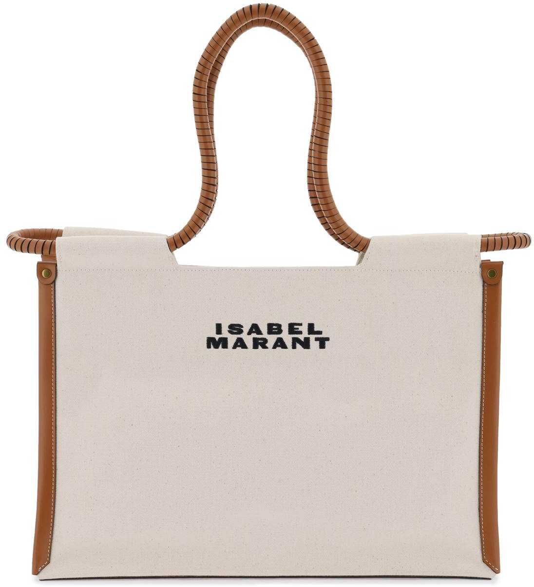 Isabel Marant canvas tote bag finished with contrasting embroidered logo at front. Smooth leather tubular handles and trimmings, fabric-lined interior with one open pocket.