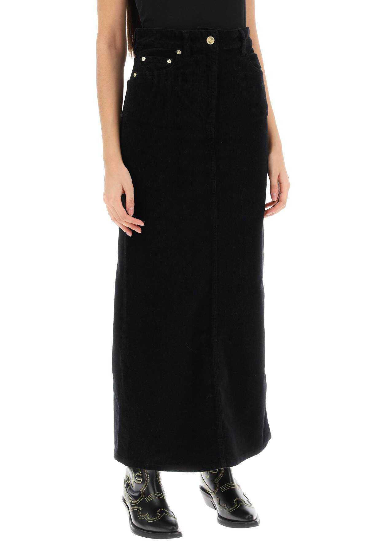 Ganni column skirt crafted in stretch organic cotton corduroy with five-pocket design. It features front fastening with zipper fly and button, belt loops and a deep vent at center back. Branded with logo patch on the back. Ankle length. The model is 177 cm tall and wears size EU 34.