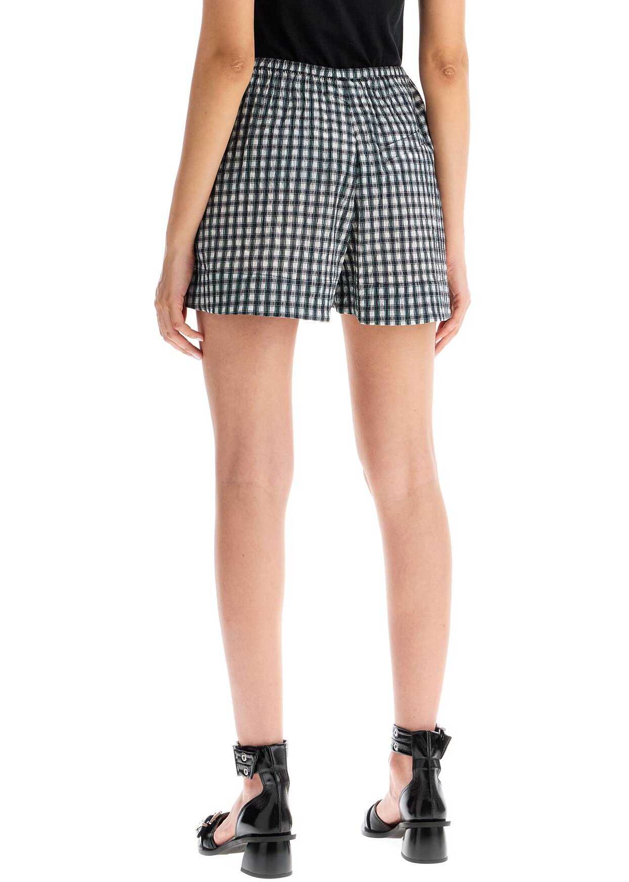 These Ganni seersucker shorts feature a black and white checkered pattern with blue details. Made from a stretchy blend of organic cotton and recycled polyester, they have a semi-shiny finish and comfortable fit. The elastic waistband and slanted pockets on the sides complete this casual and versatile piece. The back pocket is decorative. The model is 177 cm tall and wears a size EU 34.