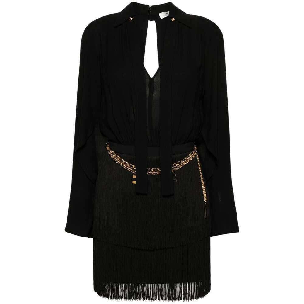 Black crepe texture scarf detailing fringe detailing chain-link detailing detachable design classic collar long sleeves slit-sleeve overlay logo plaque v-neck open back thigh-length concealed rear hook and zip fastening