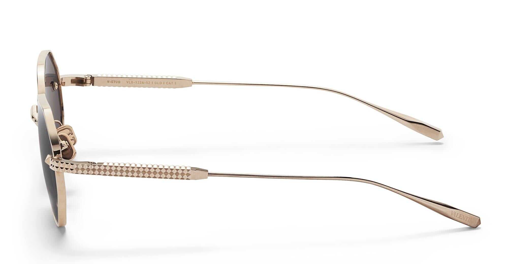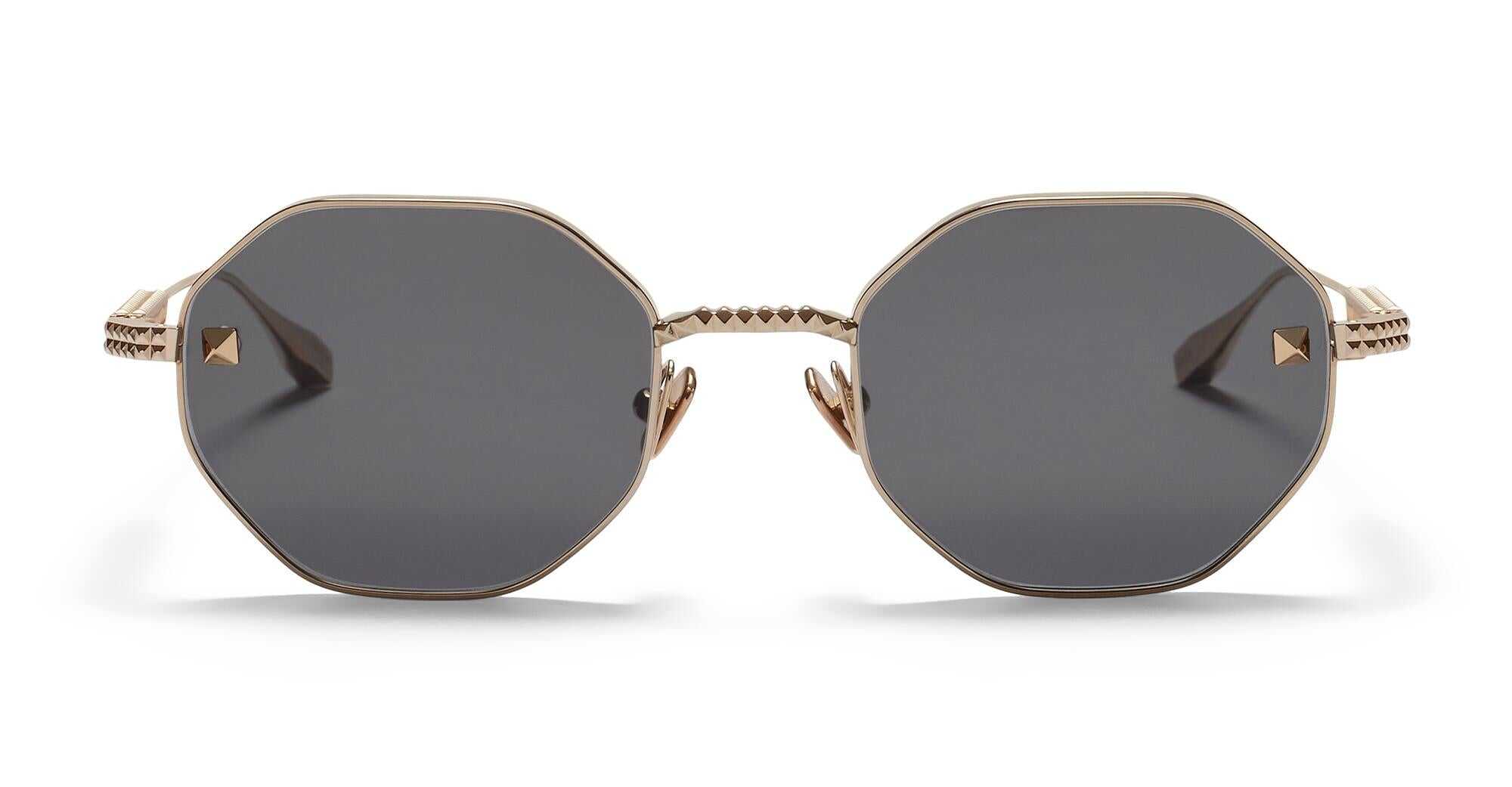 Valentino V-STUD - WHITE GOLD (VLS-122A-52) are hexagonal sunglasses made in Japan. They feature white gold Japanese titanium structure with 3D Valentino studs embellishments, and smoke grey lens with 100% UV protection.
