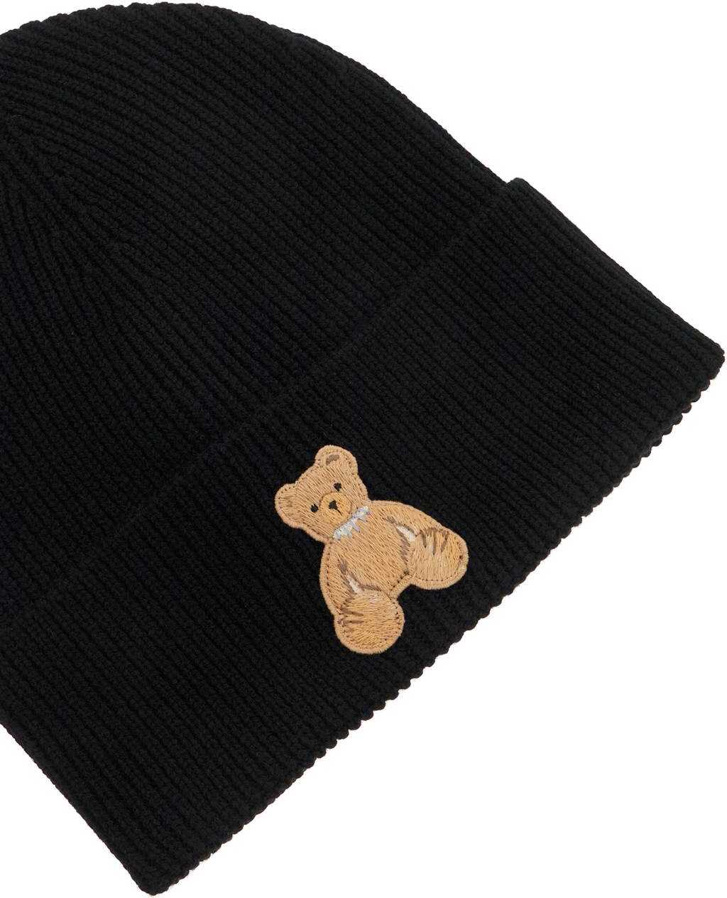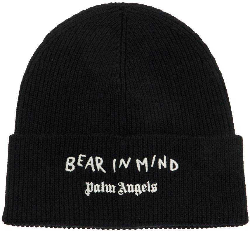 The Palm Angels beanie hat is made of ribbed wool knit and features a Bear patch on the front, as well as embroidered logo lettering and "BEAR IN MIND" on the back. One size fits all.