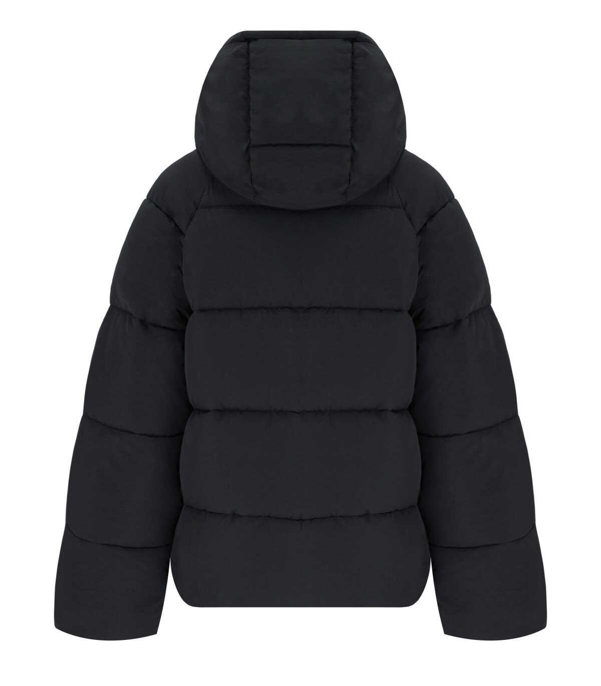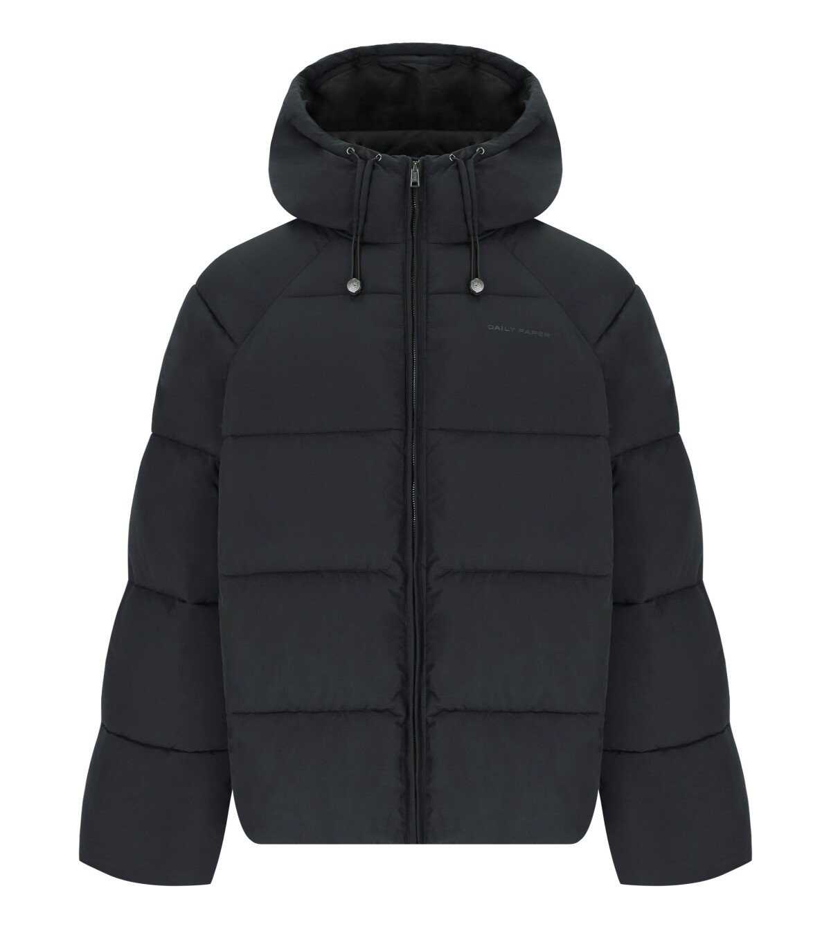 Relaxed puffer jacket by Daily Paper made of nylon in black color. Characterized by a zip closure, it features a front logo print. Equipped with a hood, it has long sleeves. Regular fit.
