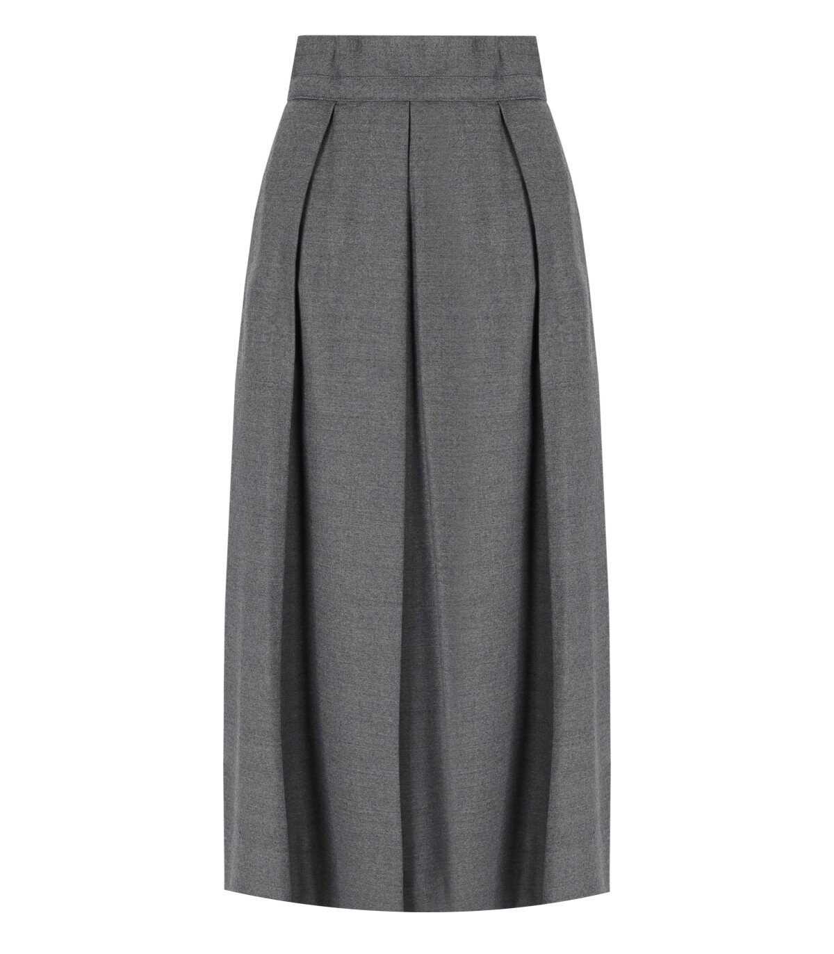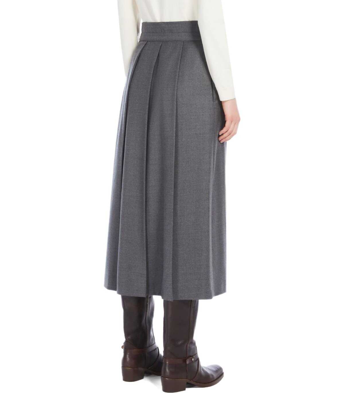 Long skirt by Max Mara Weekend made of dark grey mixed wool flannel. Characterized by a pleated design, it features an invisible side zip closure. Unlined flared model, it has a stitched detail at the waist adorned with a belt with a prong buckle on the side. Inserted pockets at the hips.